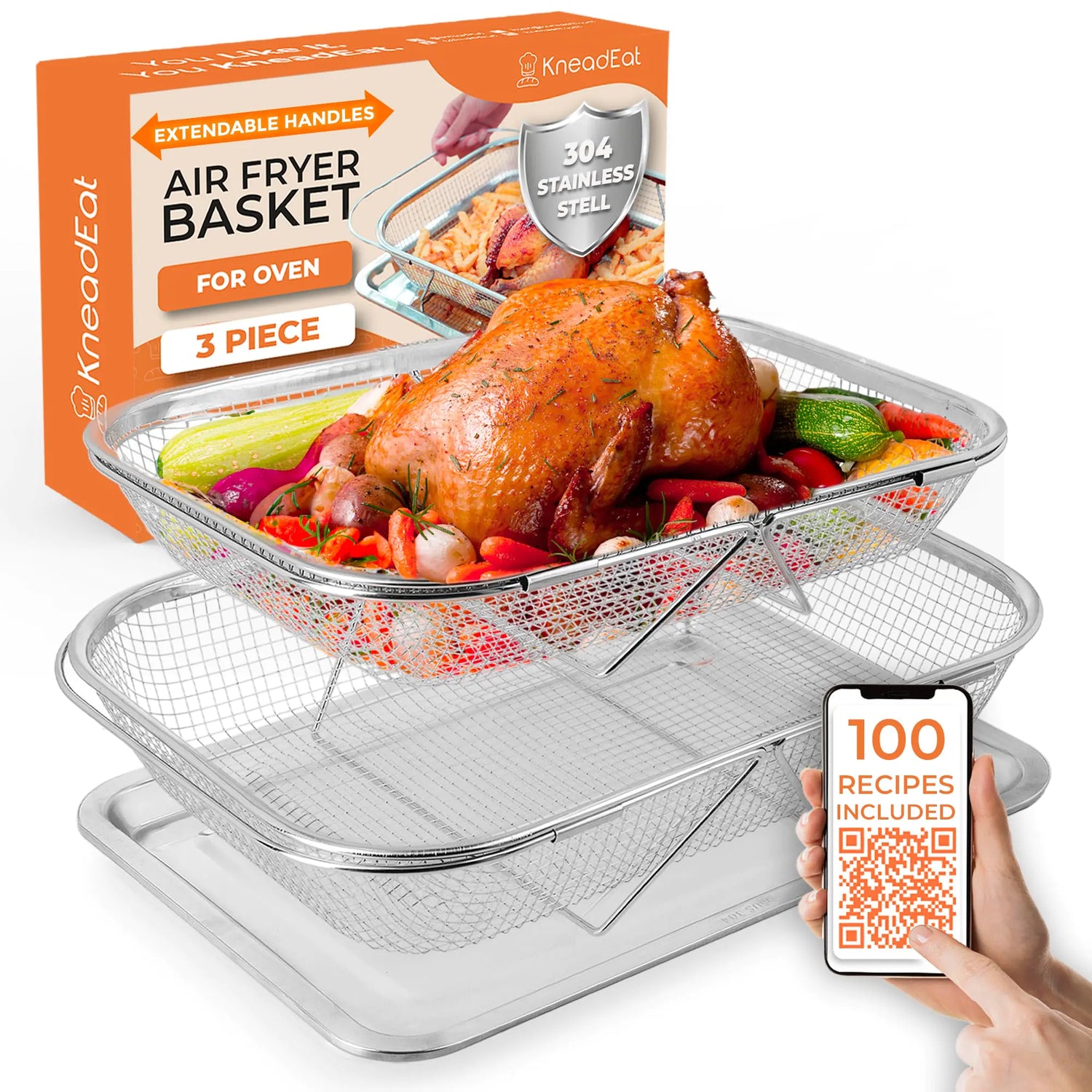 [Extendable Handles - Designed with adjustable handles the large basket (14.6” x 10.6”) expands up to 21 inches and the medium basket (12.4” x 8.8”) expands up to 18.1 inches. These handles make it easier to fit into ovens of various sizes and ensure a secure grip. Multi-Purpose Functionality - Not just for air frying: Perfect for using it as colanders for rinsing fruits and vegetables cooling racks for baked goods or draining trays for fried foods. A true all-in-one kitchen essential. Premium 304 Stainless Steel - Made with premium food-grade stainless steel 304 this air fryer basket resists rust heat and wear. Built to last it ensures safe healthy and reliable cooking every time. Crispy Results with 360° Heat Circulation - The air fryer basket for oven set design allows for full airflow around your food ensuring even cooking and crispy perfection. Say goodbye to soggy results and enjoy golden-brown dishes without burning or excess oil. Perfect for Family-Sized Meals - With large and medium baskets and a spacious oven tray (11.61” x 15.55”) this set is ideal for preparing meals for families or entertaining guests. Cook more in less time without compromising on quality or taste. Dishwasher Safe and Easy to Clean - Made for convenience all pieces are dishwasher safe and simple to clean by hand making post-cooking cleanup quick and easy. Healthier Oil-Free Cooking - Compatible with most air fryer ovens and convection ovens this set allows you to achieve crispy flavorful dishes with little to no oil. Perfect for healthier lifestyles.]
