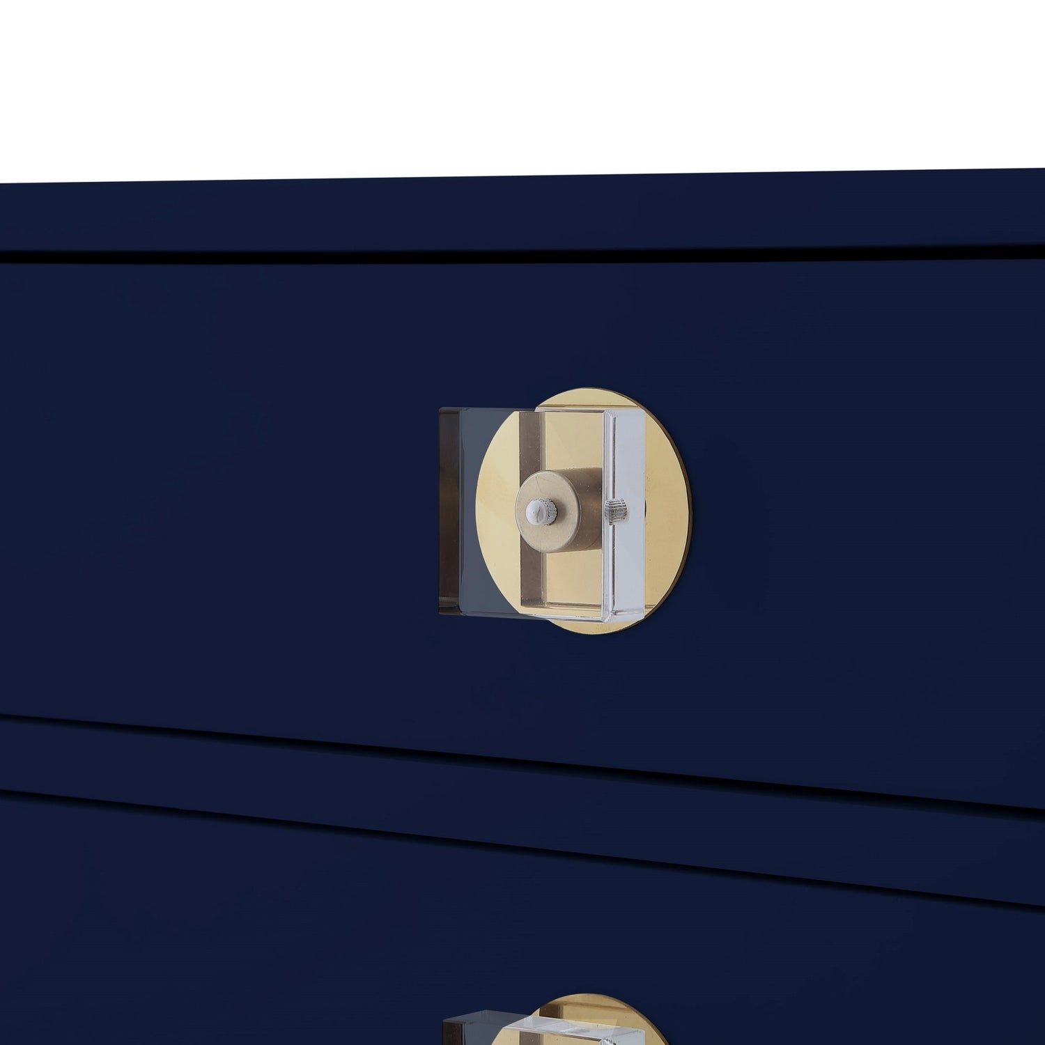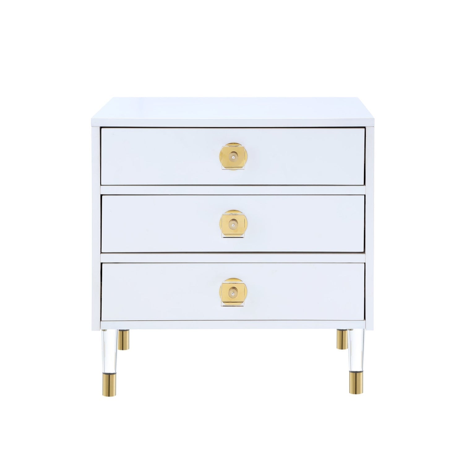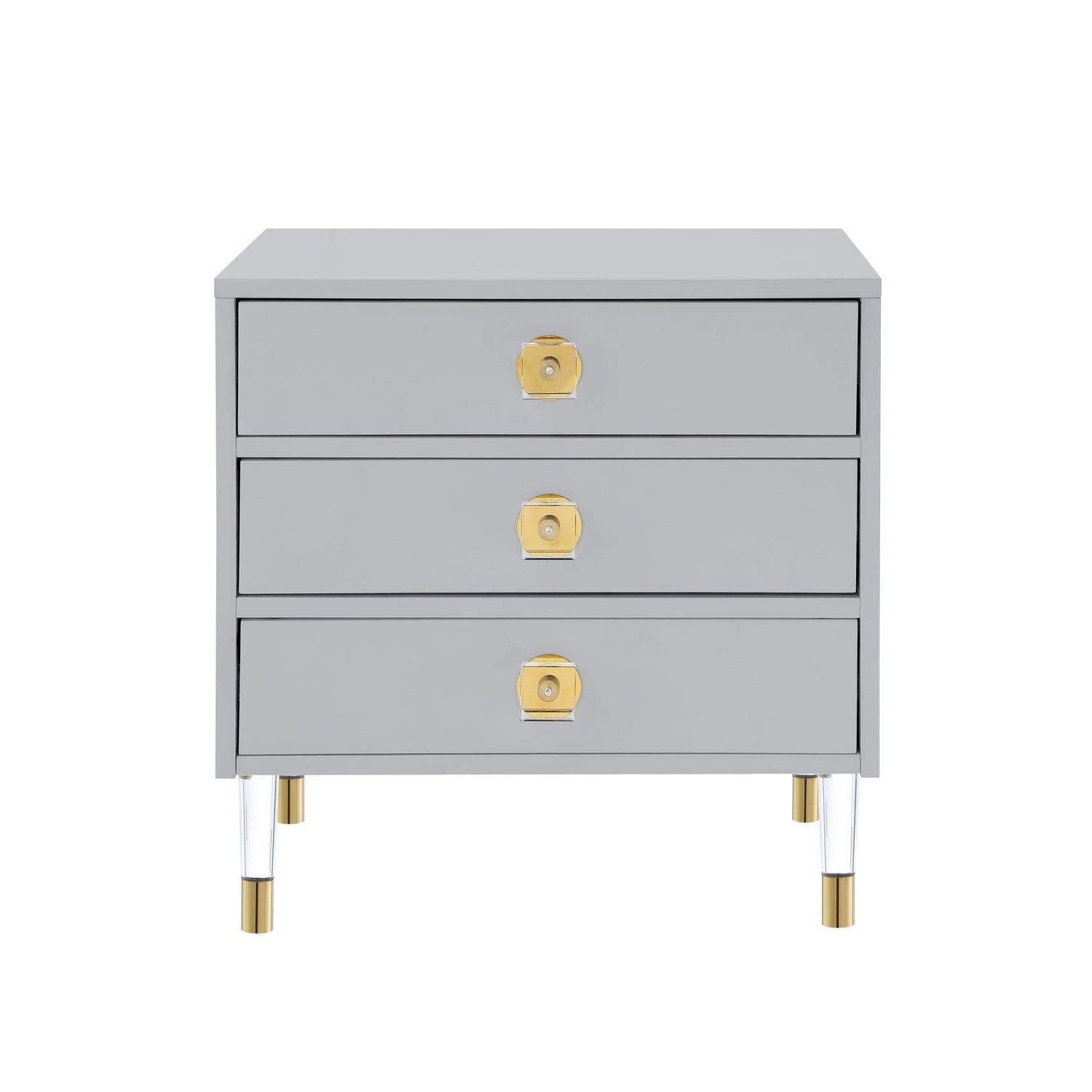 - ATTRIBUTES: 3 Drawers, High Gloss Finish, Acrylic/Gold Knobs and Legs