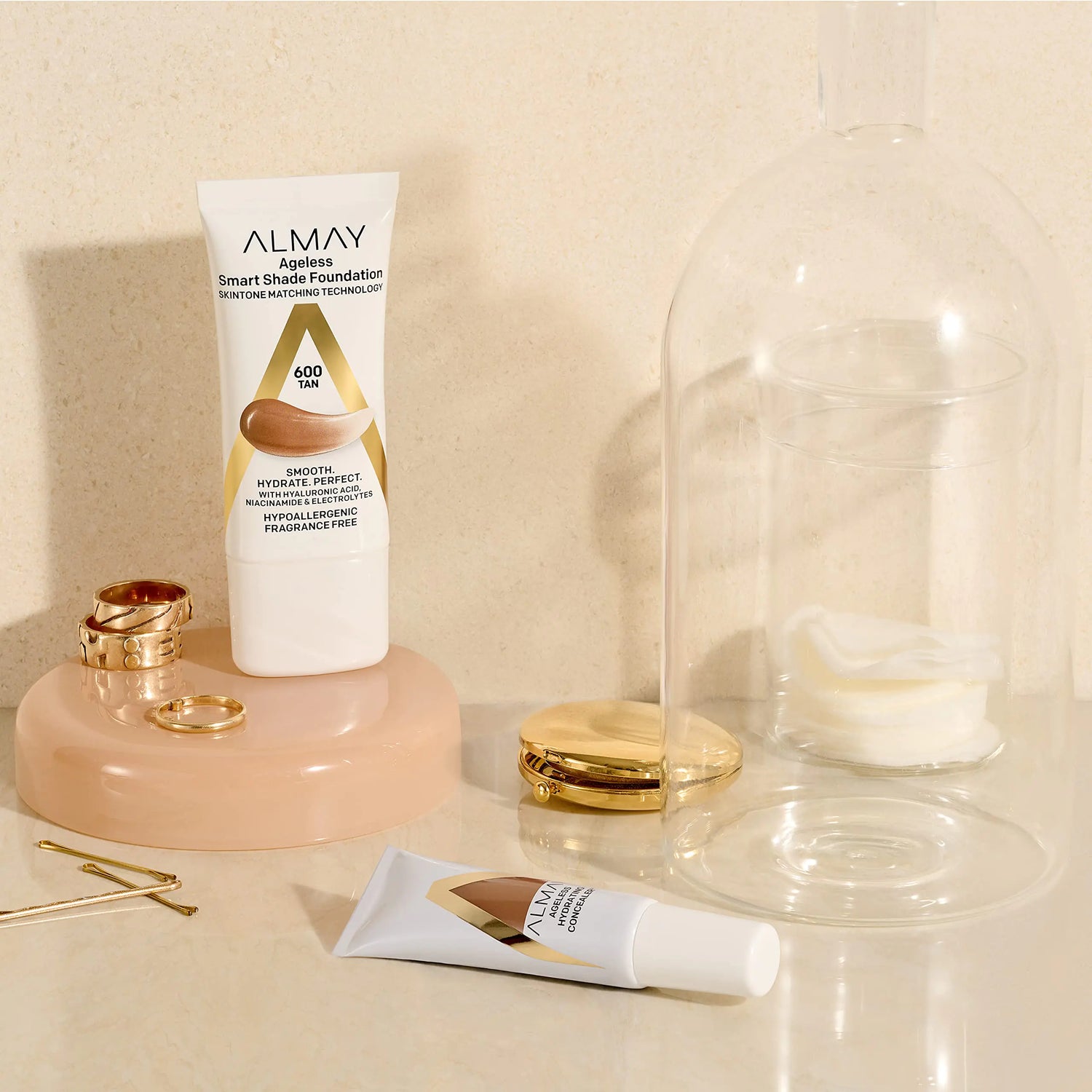 Almay’s new and improved hypoallergenic Smart Shade Foundation delivers your perfect shade match while encouraging you to embrace your skin no matter your age. The lightweight, medium-coverage, natural finish liquid foundation starts out white (like its predecessor) and transforms to your ideal shade as you blend. The formula now has a skin-reviving complex made up of a team of skin- caring ingredients that work to replenish, smooth, and protect skin. Niacinamide helps even skin tone and reduce the appearance of discoloration. Hyaluronic acid hydrates and plumps the look of skin. Electrolytes contribute to well-balanced skin and help skin retain its moisture. Vitamins C and E protect against environmental aggressors. Upon application skin looks fresh and feels moisturized and comfortable—no caking. In just two weeks, skin appears lifted and smooth, and wrinkles appear minimized. Plus, not only is Ageless Smart Shade Foundation gentle on skin, it is gentle on the earth. The cap is made from 90% PCR material and the tube is made from 72% PCR material. As always, this Almay product is suitable for sensitive skin, hypoallergenic, dermatologist tested, clean, cruelty free, and fragrance free. It is also formulated without added parabens, mineral oil, DMDM Hydantoin, and palm oils.