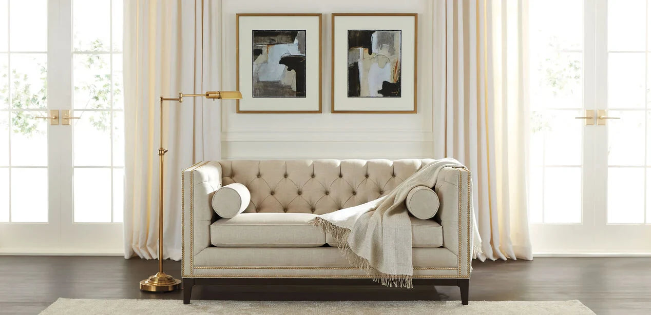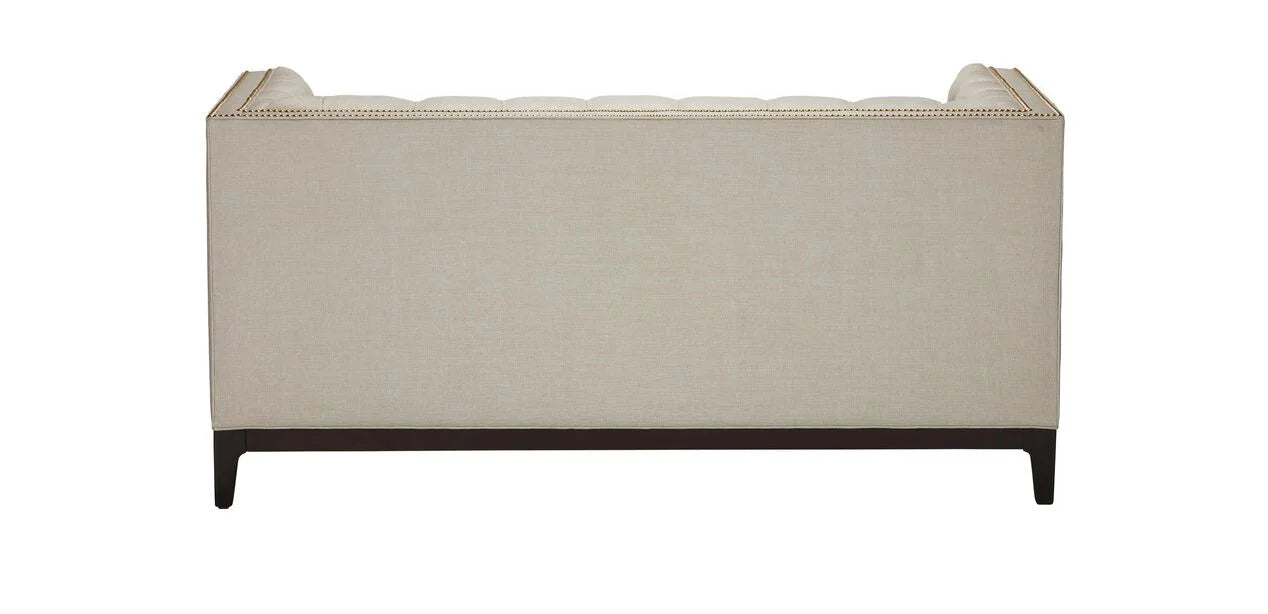 Experience the epitome of modern sophistication with the Anderson Loveseat by Ethan Allen. This elegant, tuxedo-style loveseat is crafted to deliver both style and comfort in compact spaces. Featuring shelter arms and a welted tight back paired with loose, welted seat cushions, it includes two bolster pillows for added luxury. Hand-tailored by expert artisans in North America, the Anderson Loveseat boasts a multi-ply engineered panel frame with mortise and tenon joints for exceptional stability. The poly-wrapped foam cushions provide a structured yet soft seating experience. Choose from a range of custom fabrics and finishes, including optional Antique Gold nailhead trim and Northwood wood base. For an ultra-classic touch, diamond tufting options are available. Perfect for any living space seeking both timeless appeal and supreme comfort.