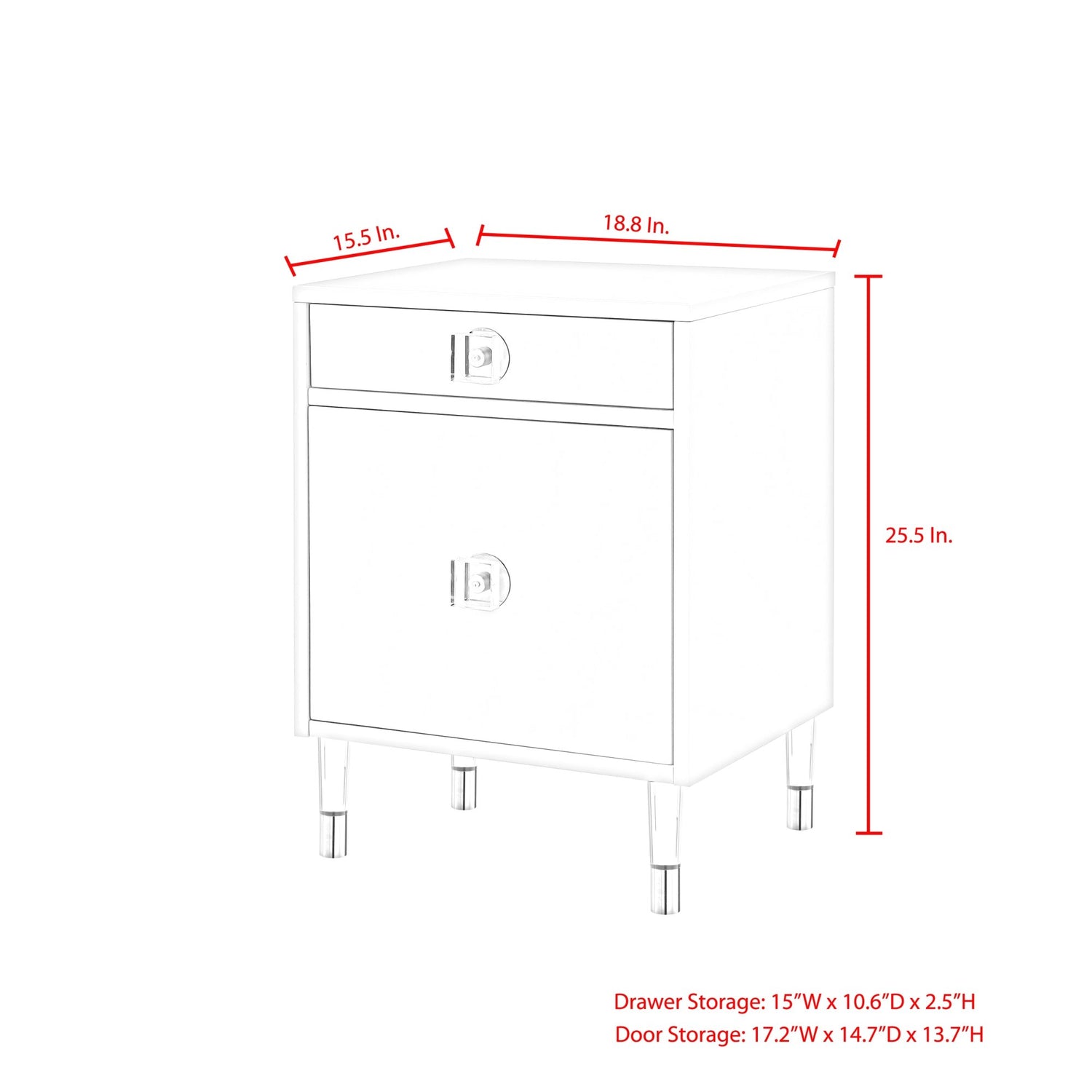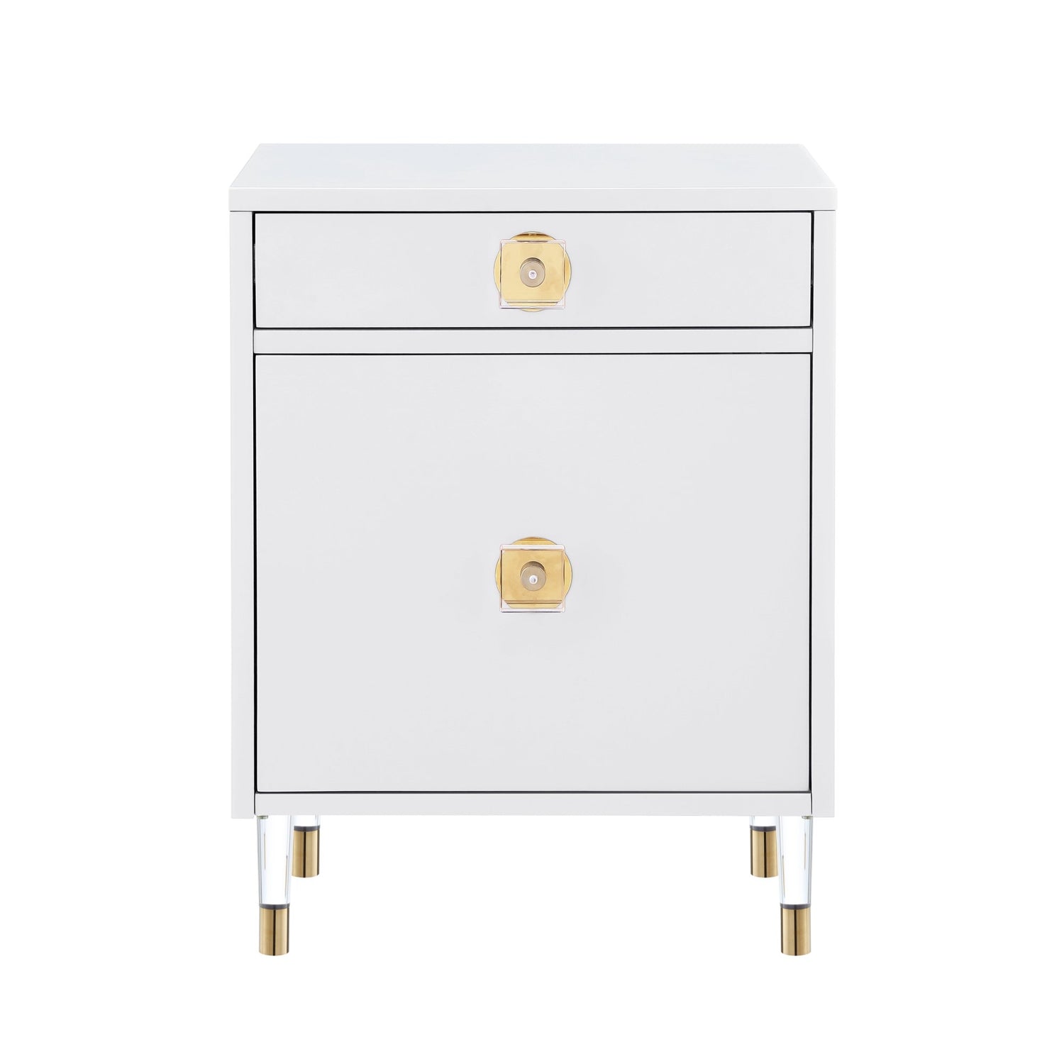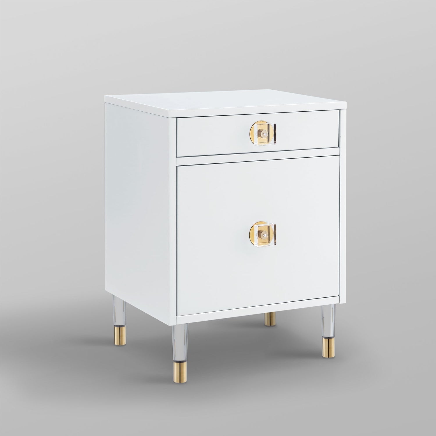 - MODERN GLAM - Modern high gloss finish, acrylic tapered legs with gold metal tips and matching acrylic knob will make a statement in any room