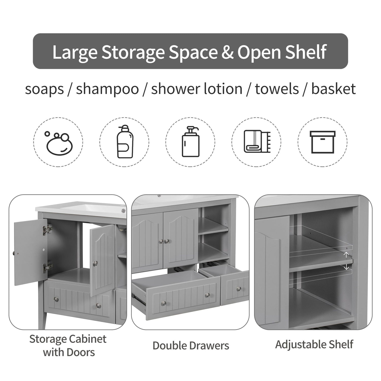 Bathroom Vanity With Ceramic Basin, Bathroom Storage Cabinet With Two Doors And Drawers, Solid Frame, Metal Handles - Gray