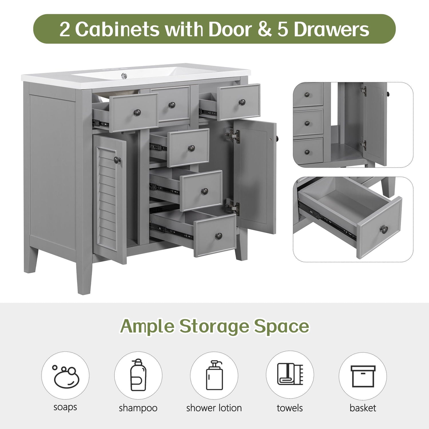 Ample Storage: Features two cabinets with doors and five drawers (one decorative) with slide rails, providing sufficient space for bathroom essentials like soaps, towels, and shampoos.