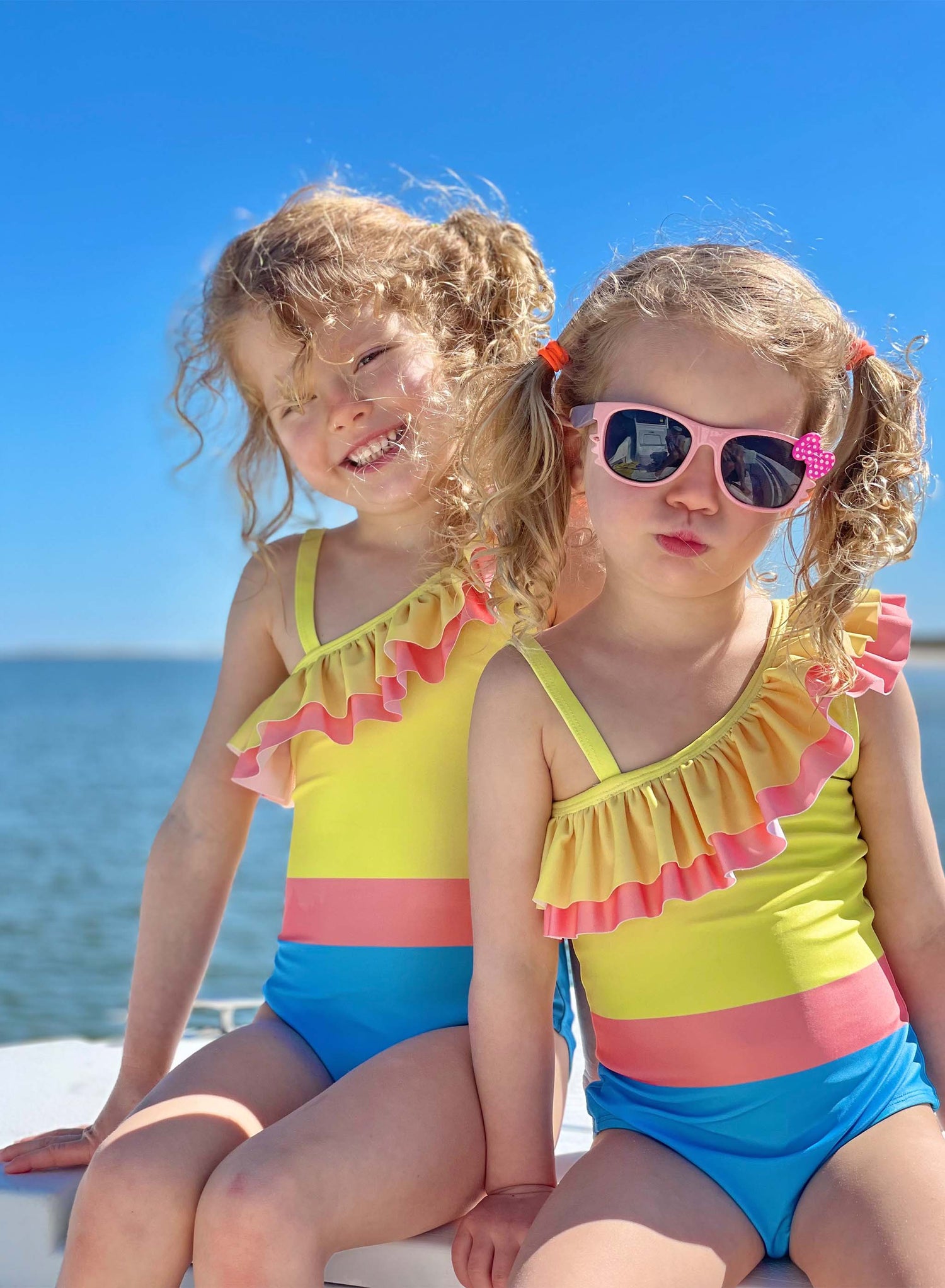 Our best selling one piece frill swimsuits are back in stock for the summer! They are made with a fabric blend that offers a soft feel, while the ruffles and 1-shoulder design create a fashionable look. They are designed with UPF 50+ fabric that stands up to chlorine and sun and our styles can be matched with the whole family!