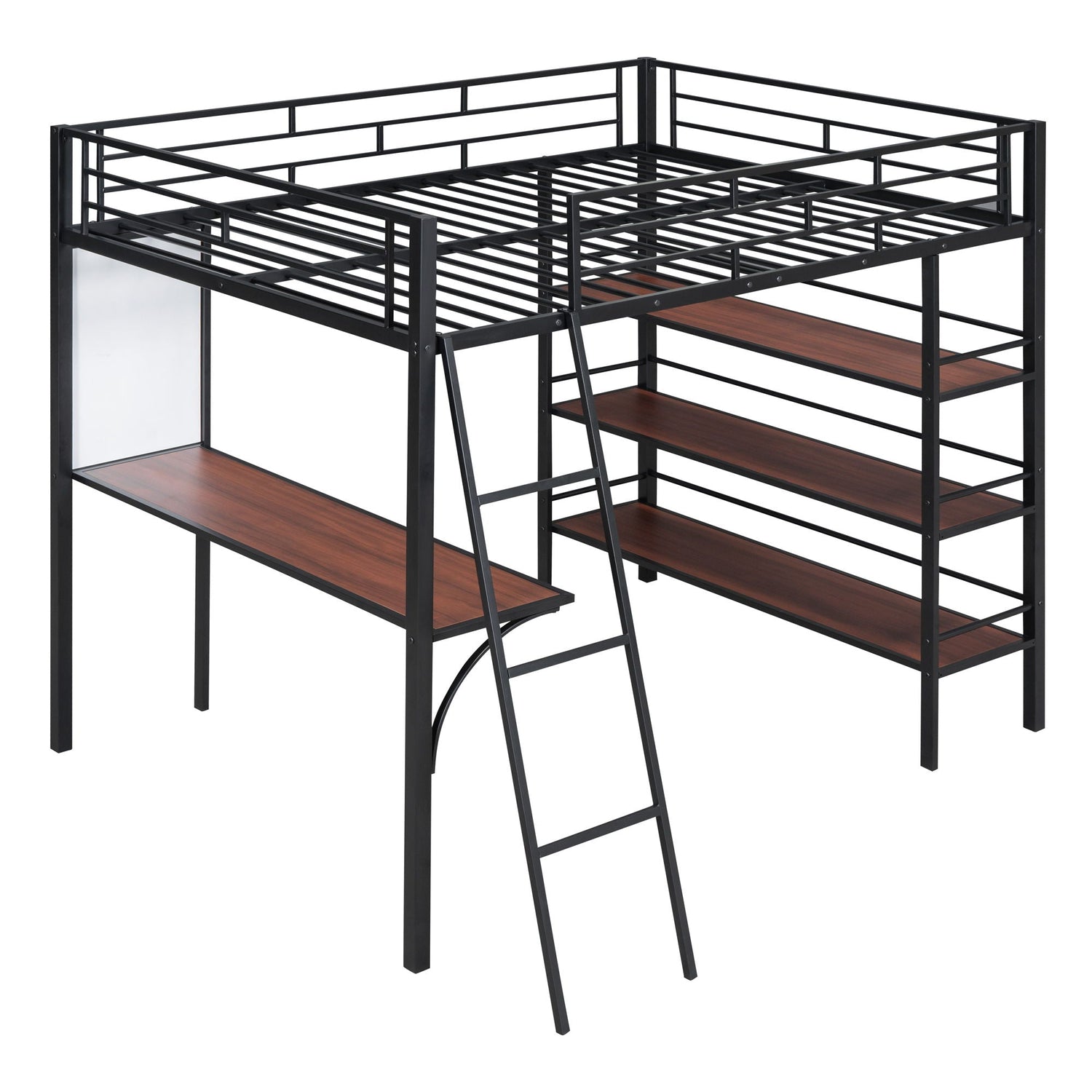 Full Size Loft Bed With 3 Layers Of Shelves And Desk, Stylish Frame Bed - Black