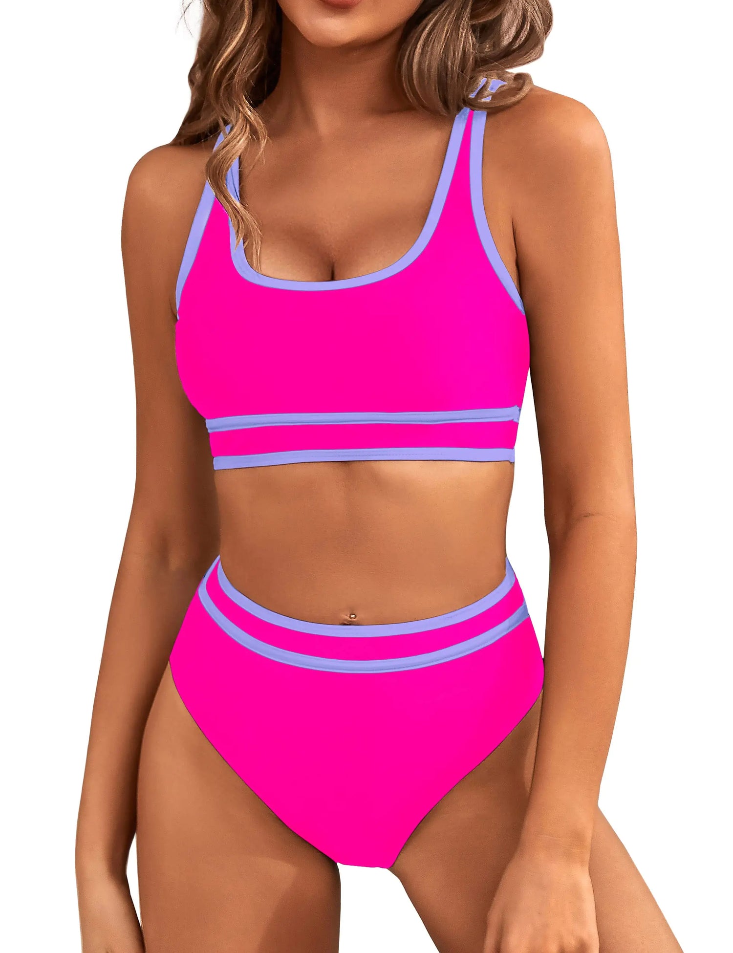 BMJL Women's High Waisted Bikini Sets Sporty Two Piece Swimsuits Color Block Cheeky High Cut Bathing Suits Small Hot Pink011