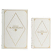 - Stylish Storage: Adorable pair of book boxes with faux leather covers in white and gold, printed with "French Traditions".