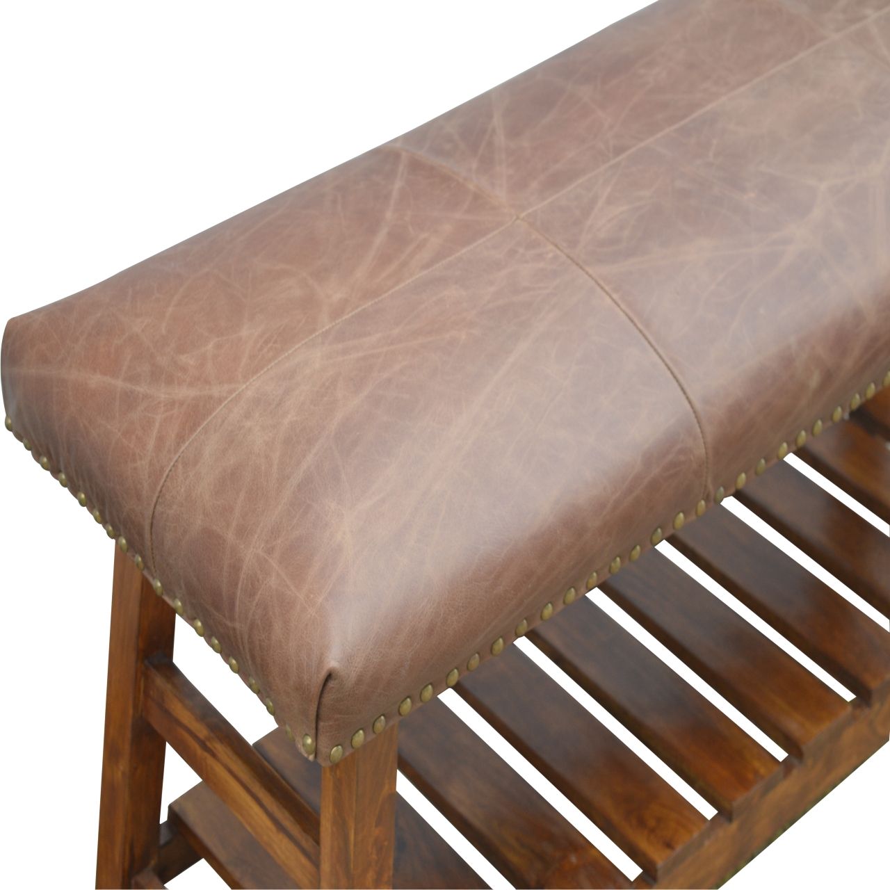 - Buffalo Hide Hallway Bench - This hallway bench with slatted shelf is constructed from 100% solid mango wood and the seat is upholstered in 100% buffalo hide leather. Other features include antique brass studs around the leather, and straight feet which have a light walnut finish. As well as being a beautiful piece of furniture it is also very practical to put footwear on and off as you enter your house and with an under shelf to place your house slippers or footwear. This is a perfect addition to your home.