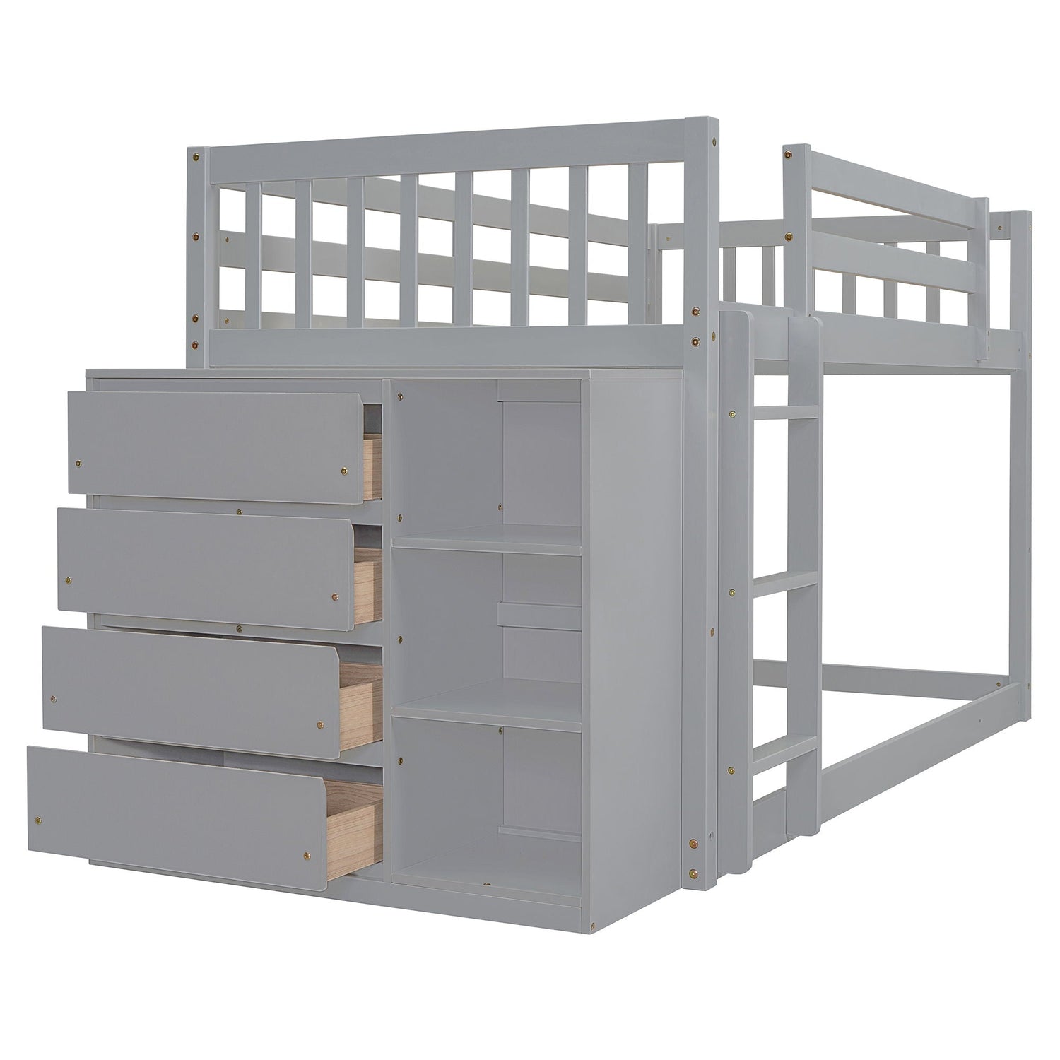 Full Over Full Bunk Bed With 4 Drawers And 3 Shelves - Gray