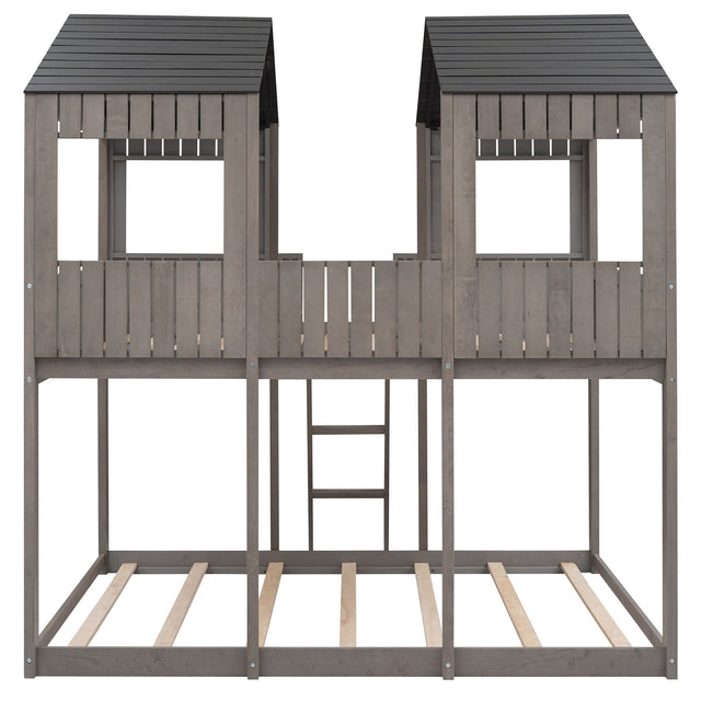 Full Over Full Bunk Bed With Roof, Window, Guardrail, Ladder - Antique Gray