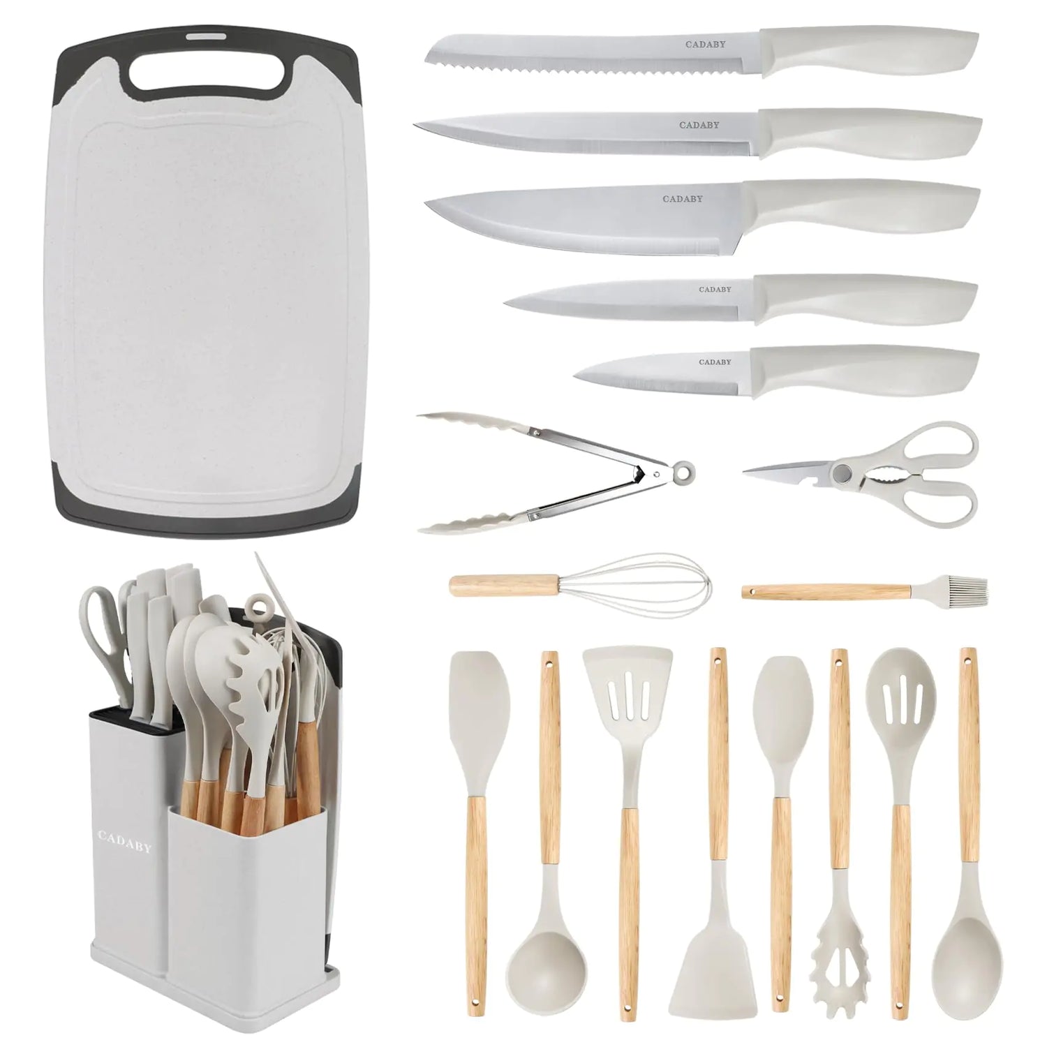 CADABY 19PCS Kitchen Knife Set with Block Professional 5 PCS High Carbon Stainless Steel Cooking Knives Set Knife Block Set with 11 PCS Silicone Kitchen Utensils Set Convenient White