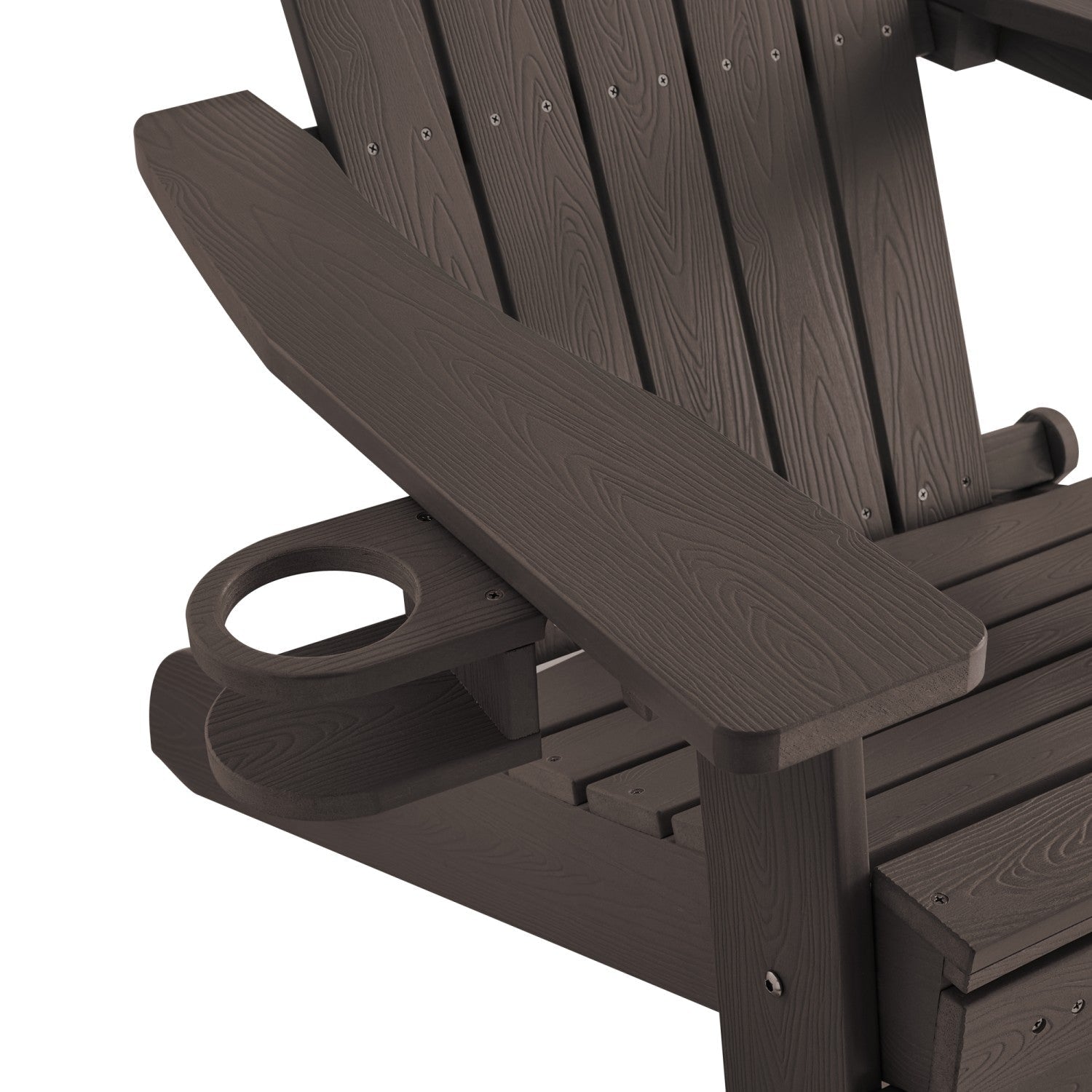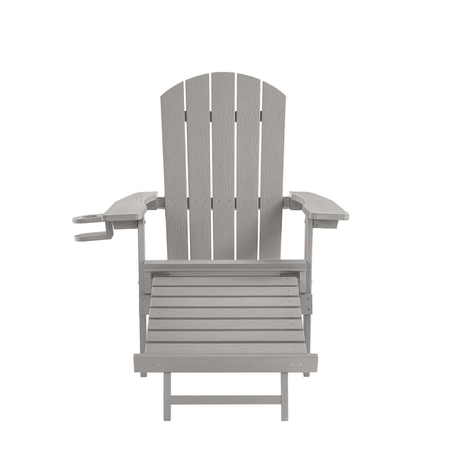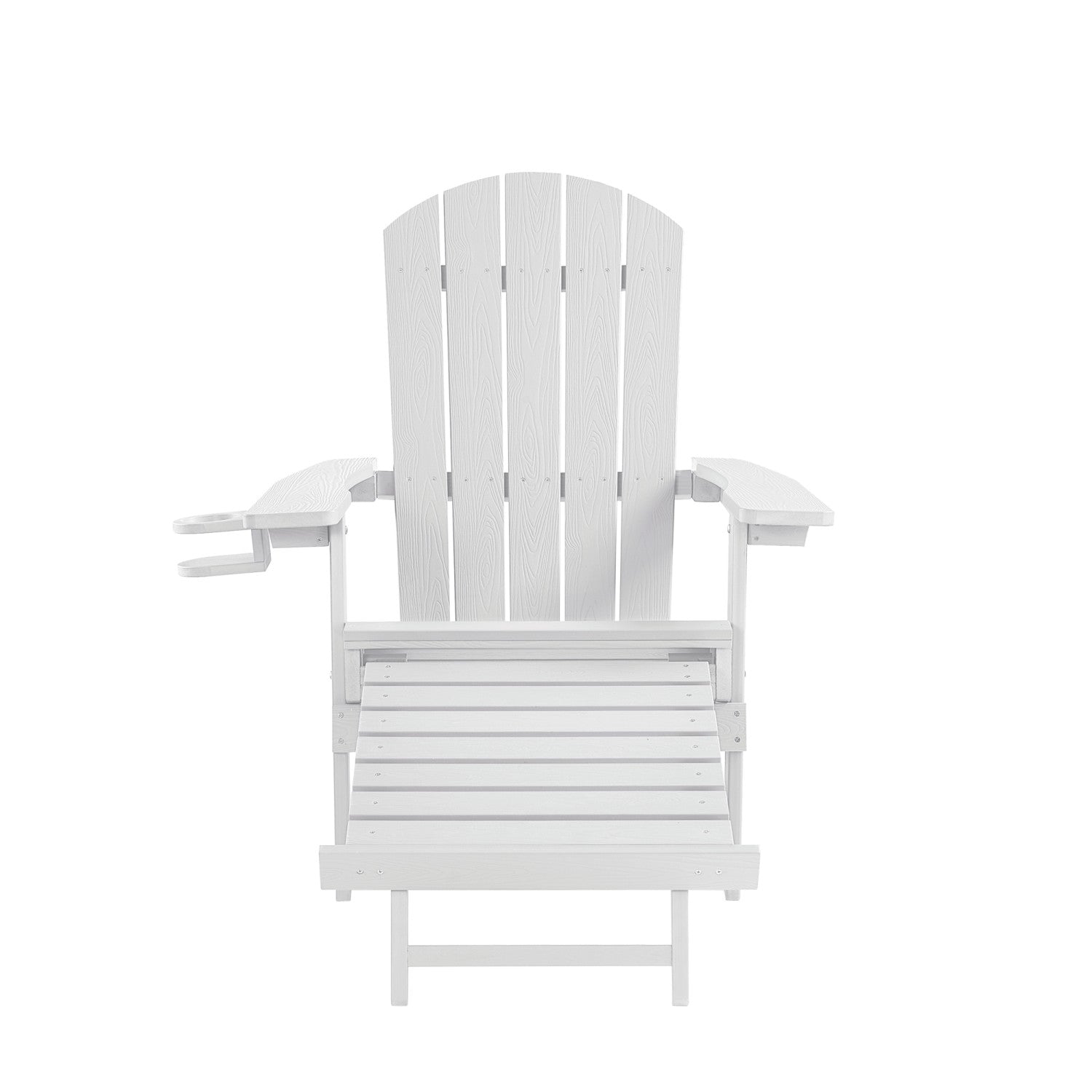 - FOOTREST/CUP HOLDER - Versatile wood-like chair provides convenient comfort and accessibility to any setting. Easy pull-out footrest and handy cup holder add a homey country look to any patio, backyard, sunroom, porch, or outdoor decor.