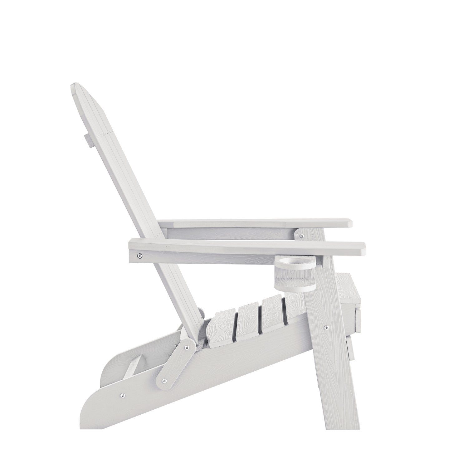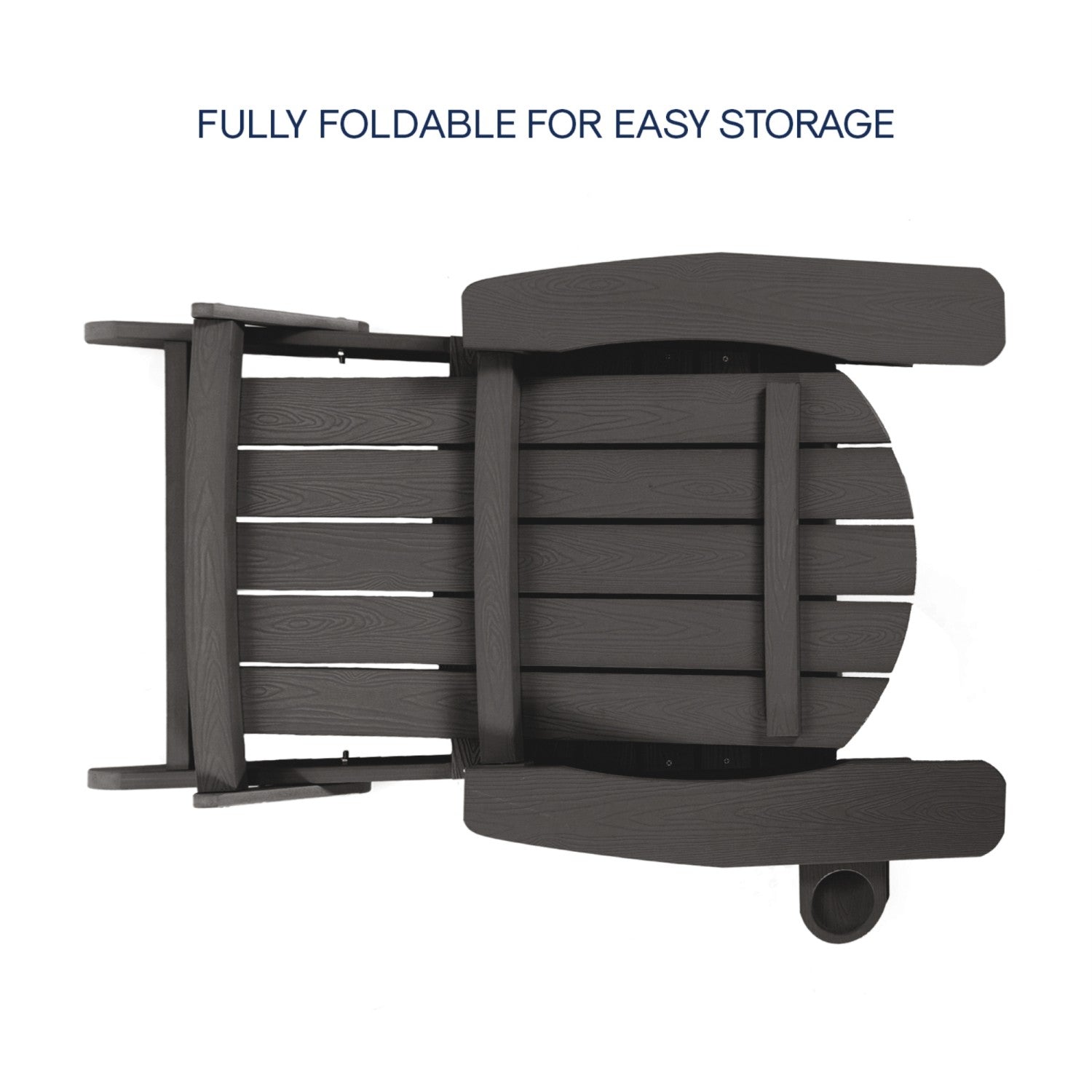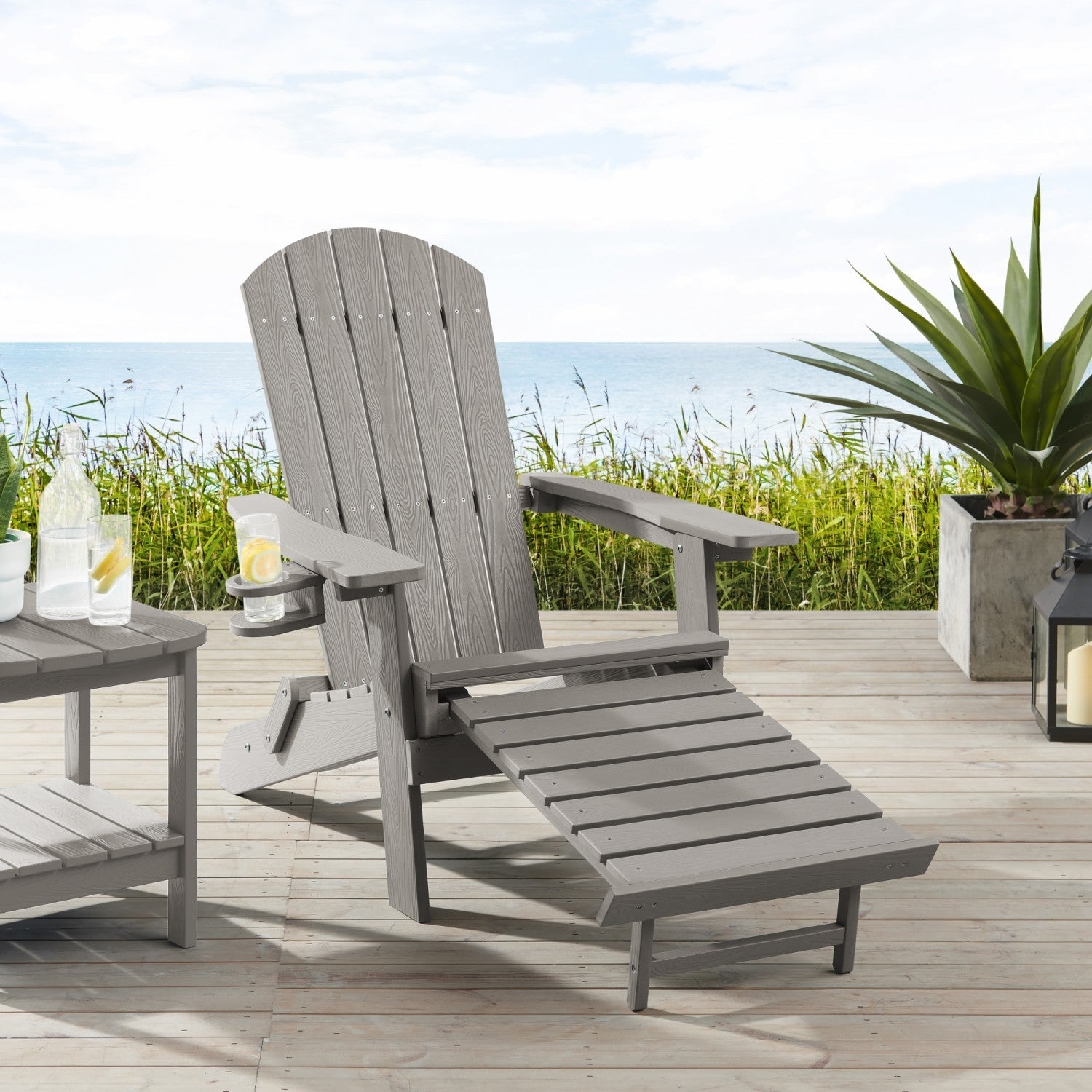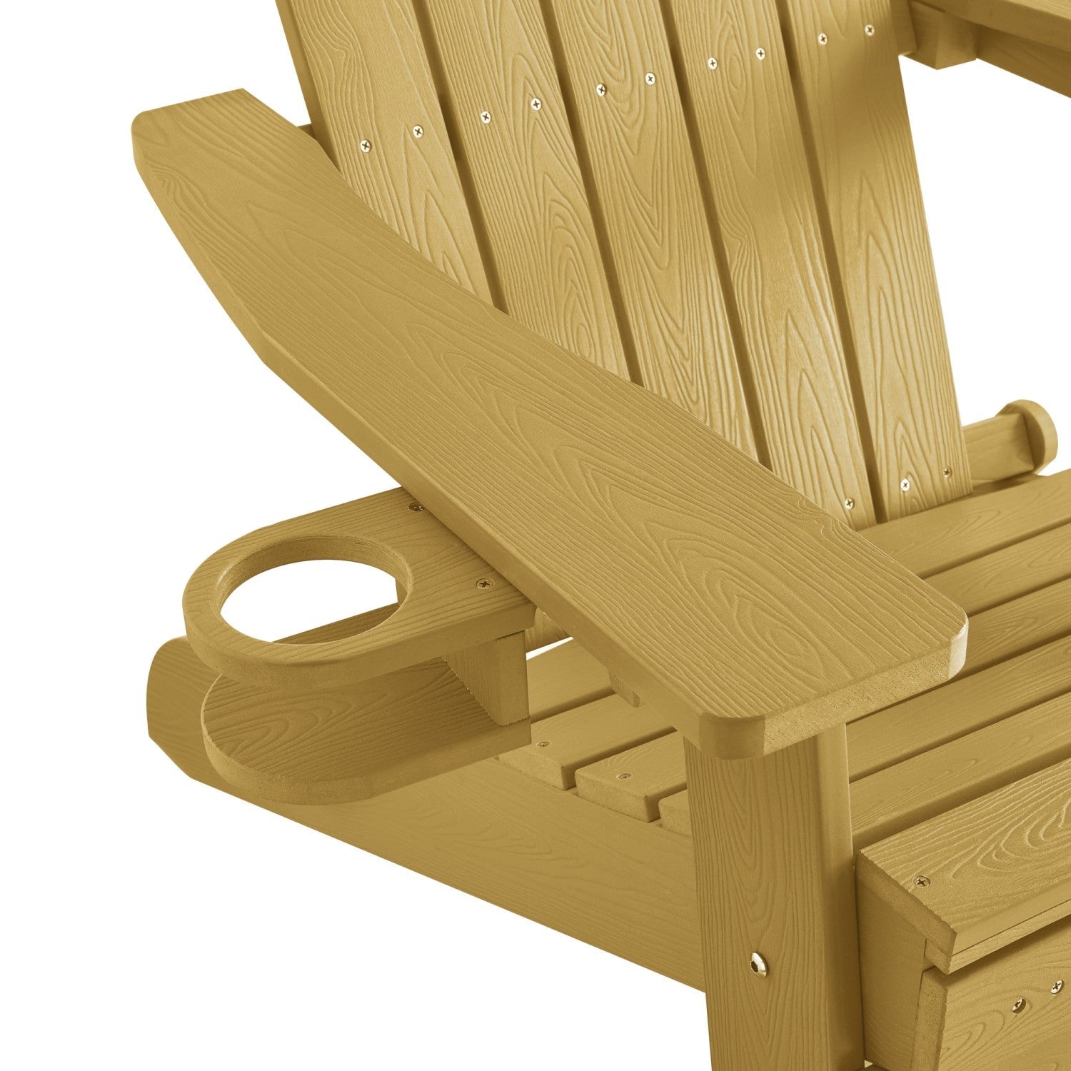 - FOOTREST/CUP HOLDER - Versatile wood-like chair provides convenient comfort and accessibility to any setting. Easy pull-out footrest and handy cup holder add a homey country look to any patio, backyard, sunroom, porch, or outdoor decor.