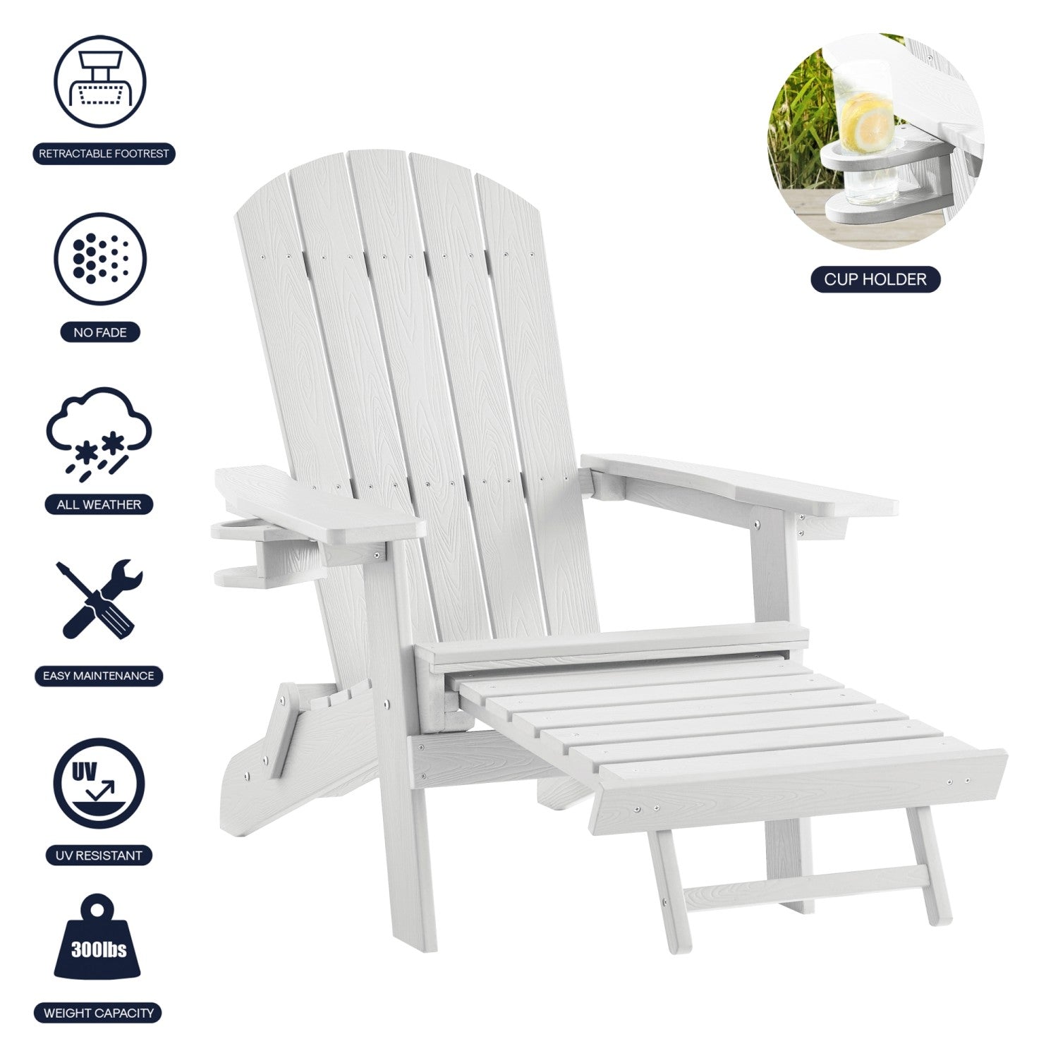 - WEATHER RESISTANT - Modern country-style adirondack chair with retractable footrest crafted from durable weather-resistant materials combines convenience, style and function. Elegant fade-proof design is perfect for any outdoor setting all year round
