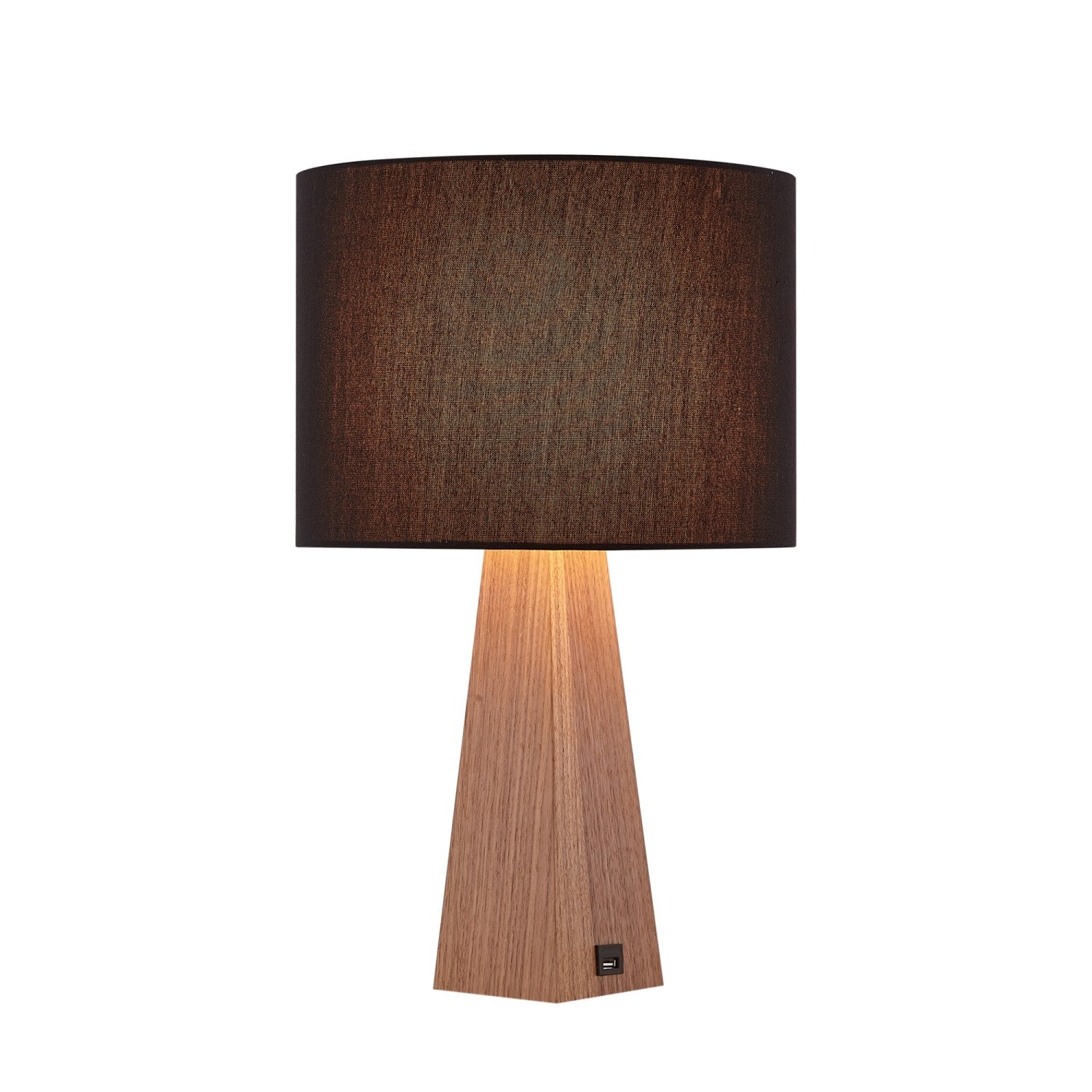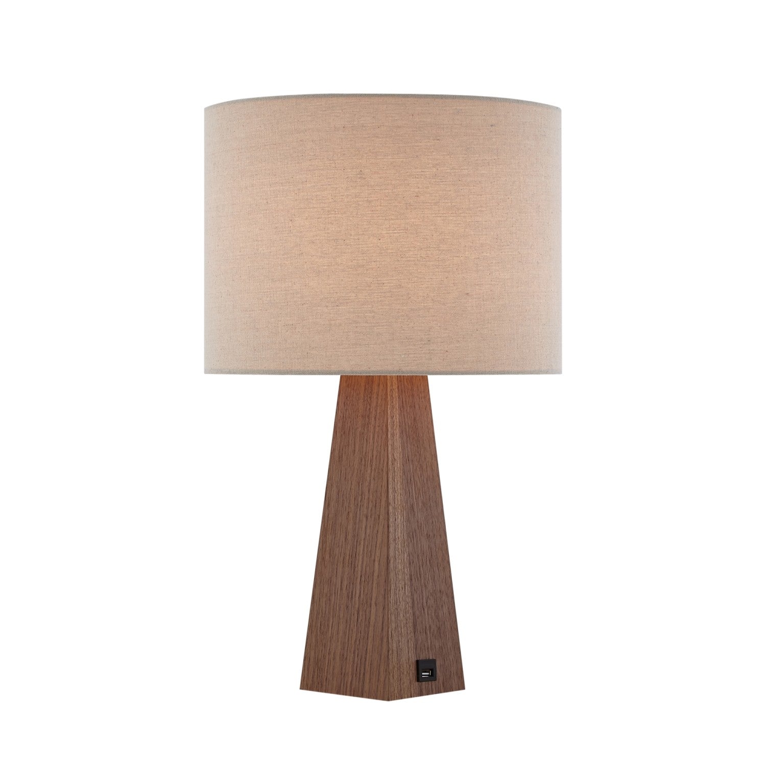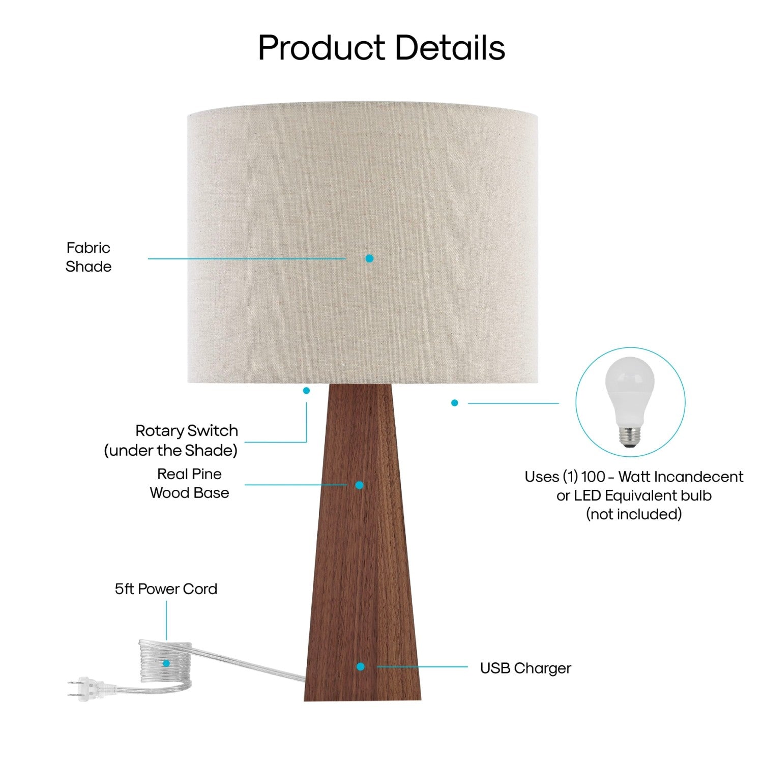 - ATTRIBUTES: 5ft Power Cord, USB Charger, Sturdy Wood Base, Linen Shade, Rotary Switch