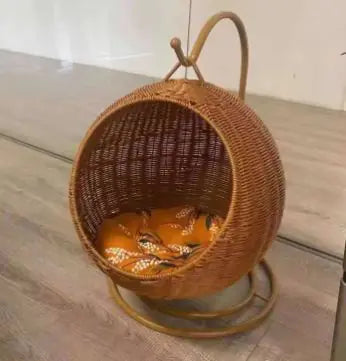 A cozy rattan hanging basket for pets up to 16 pounds. Crafted from durable, natural beige rattan, this stylish pet kennel offers a comfortable nest-like space, perfect for lounging and napping.