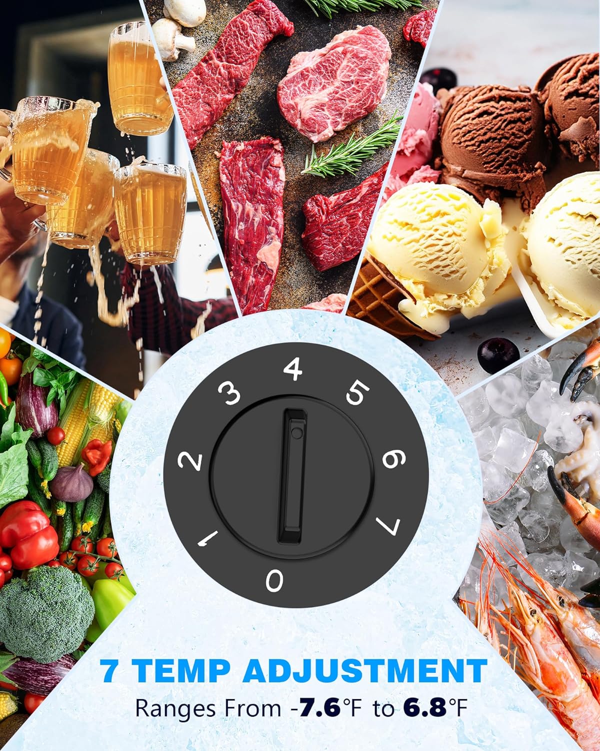 - 【7-Stage Adjustable Thermostat】The compact freezer is designed with 7 temperatures that allows you to freeze as many items as you need, ranging from -7.6°F to 6.8°F. Keep your items at the ideal temperature for optimal freshness. A "0" on the thermostat dial indicates that refrigeration has stopped.