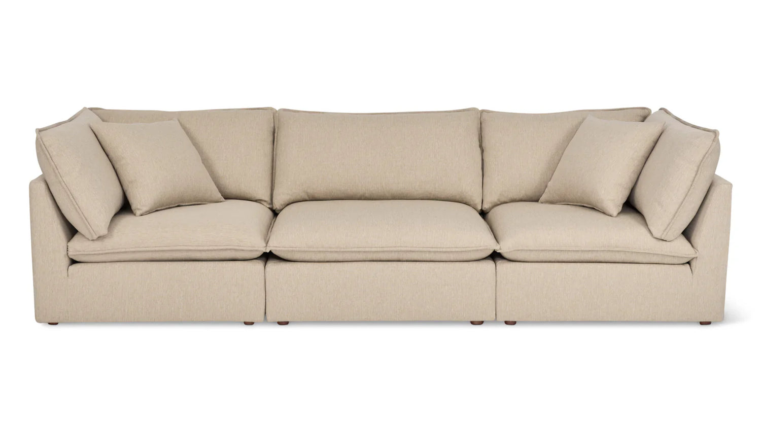 Experience the ultimate in comfort and versatility with the Chill Time 4-Piece Modular Sectional Sofa in Birch. Designed with slim proportions and a clean aesthetic, this sectional blends seamlessly into any space. The modular design allows for easy configuration to match your layout needs, while the feather-fiber blend cushions with a supportive foam core ensure lasting comfort. Wrapped in stain-resistant, non-toxic performance fabric, this sofa offers exceptional durability and is perfect for everyday living. The fully removable slipcovers make maintenance a breeze, and the hidden caster wheels on the free-floating ottoman add convenience. Featuring an eight-way hand-tied spring system for superior support, this sectional promises both comfort and style.