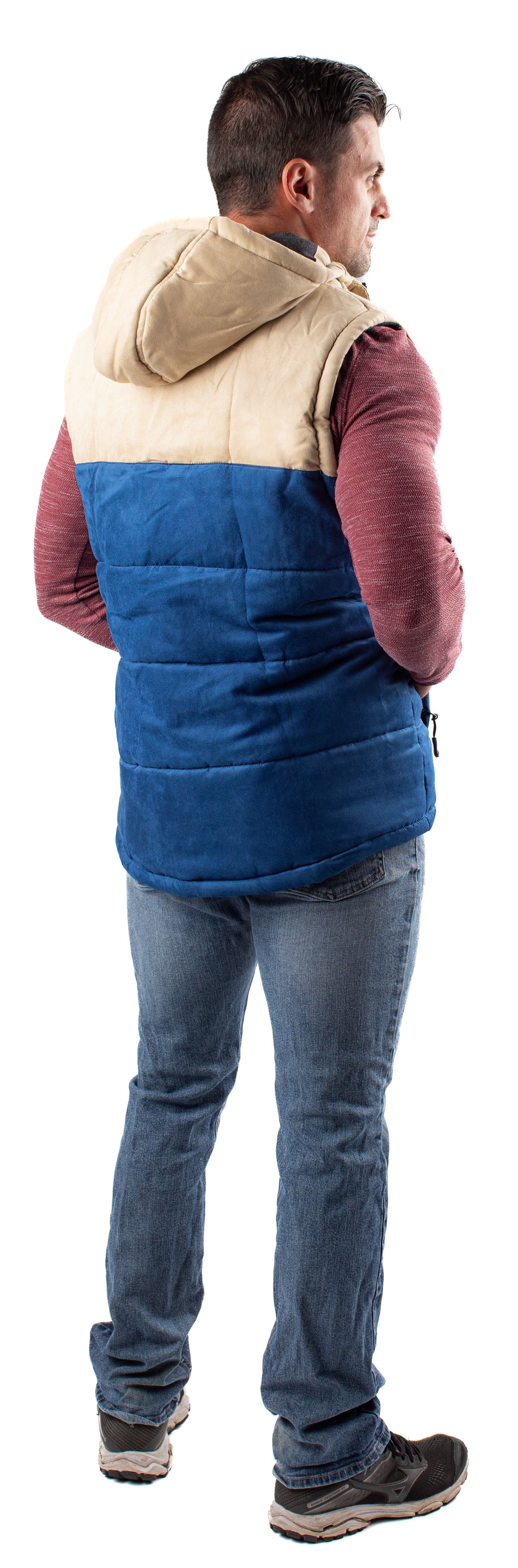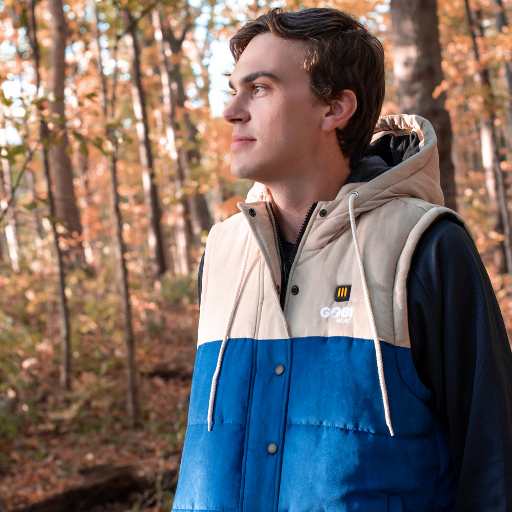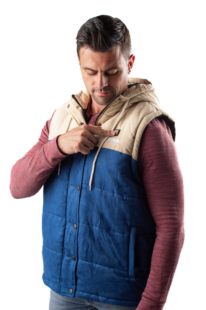 The Colt Vest is Gobi Heat’s most feature-rich vest yet (and perhaps our trendiest too). Bringing you all the features you love about our stylish outerwear, the Colt Vest is here so you can look and feel your best. Featuring a drawstring hood, this vest allows you to customize your style with ease. Kick back the clock in this thick puffer vest with a timeless two-toned design. The microsuede outer shell is available in a deep blue and cream combination named Shoreline. The Colt Vest will keep you warm all year from the inside out. Featuring a flannel-lined vest material lining, the Colt has a snap flap covering the main zipper to block out wind completely and is equipped with a Gobi Heat conductive thread heating system. Control your temperature in style with this retro feel from Gobi Heat!