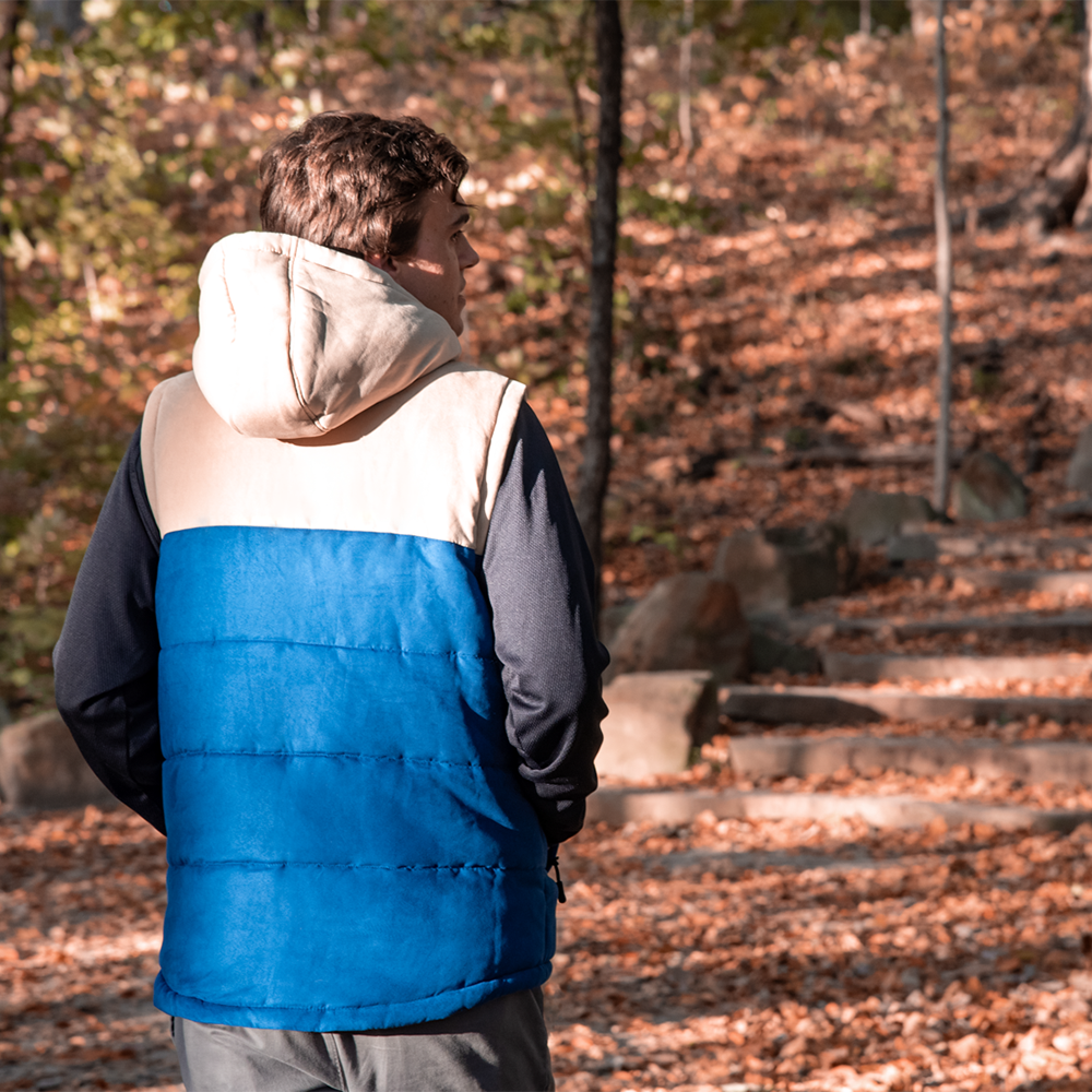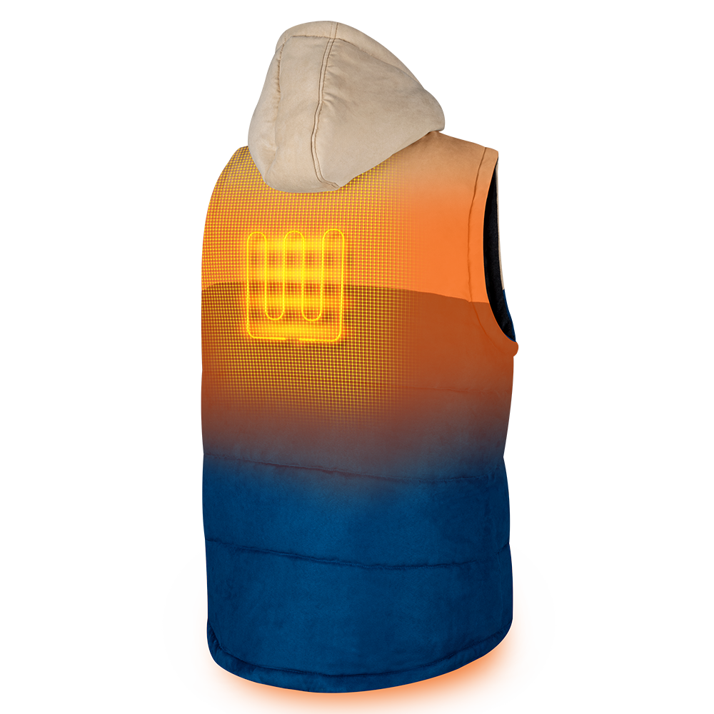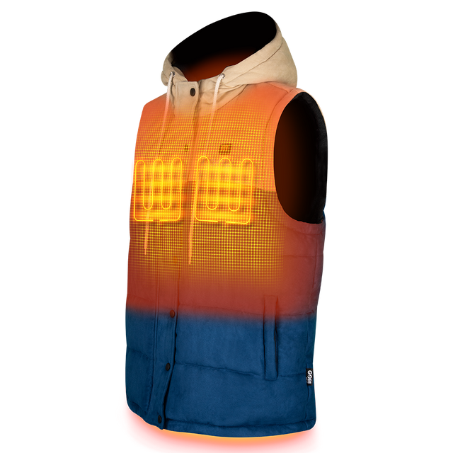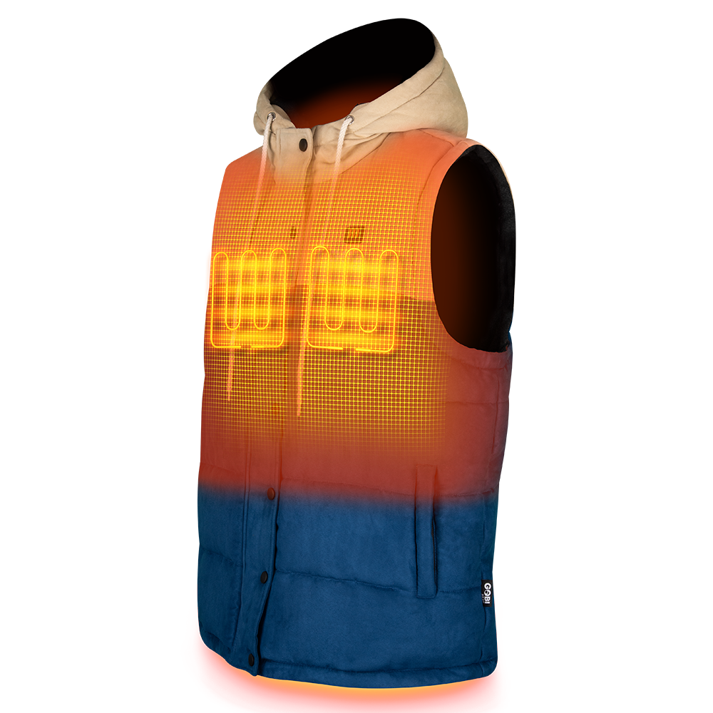 The Colt Vest is Gobi Heat’s most feature-rich vest yet (and perhaps our trendiest too). Bringing you all the features you love about our stylish outerwear, the Colt Vest is here so you can look and feel your best. Featuring a drawstring hood, this vest allows you to customize your style with ease. Kick back the clock in this thick puffer vest with a timeless two-toned design. The microsuede outer shell is available in a deep blue and cream combination named Shoreline. The Colt Vest will keep you warm all year from the inside out. Featuring a flannel-lined vest material lining, the Colt has a snap flap covering the main zipper to block out wind completely and is equipped with a Gobi Heat conductive thread heating system. Control your temperature in style with this retro feel from Gobi Heat!