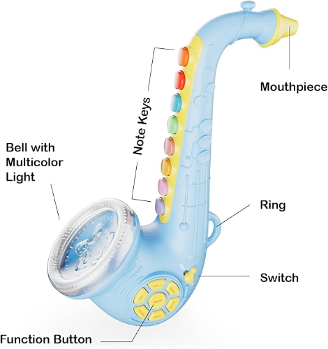 - FUN MUISIC TOYS FOR KIDS - Elevate playtime with our Toy Saxaboom! With vibrant lights and delightful melodies, this mini saxophone promises hours of musical joy for kids. Just pop in 3 AA batteries (not included) and let the magic begin.