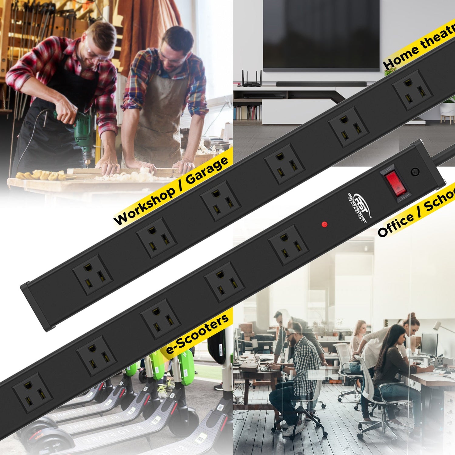 6-foot or 15-foot 14AWG heavy-duty extension cord. Provides safe and convenient power distribution. Comes with 2 mounting brackets and 4 screws for horizontal, vertical, and under-desk installation. Perfect for offices, homes, schools, and more.