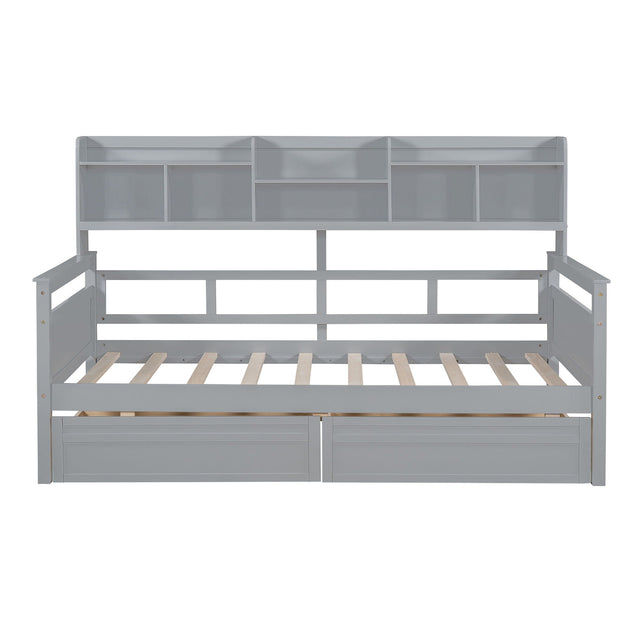 Twin Size Daybed, Slat Support, With Bedside Shelves And 2 Drawers - Gray