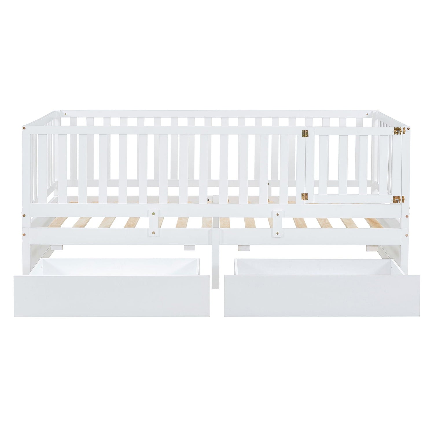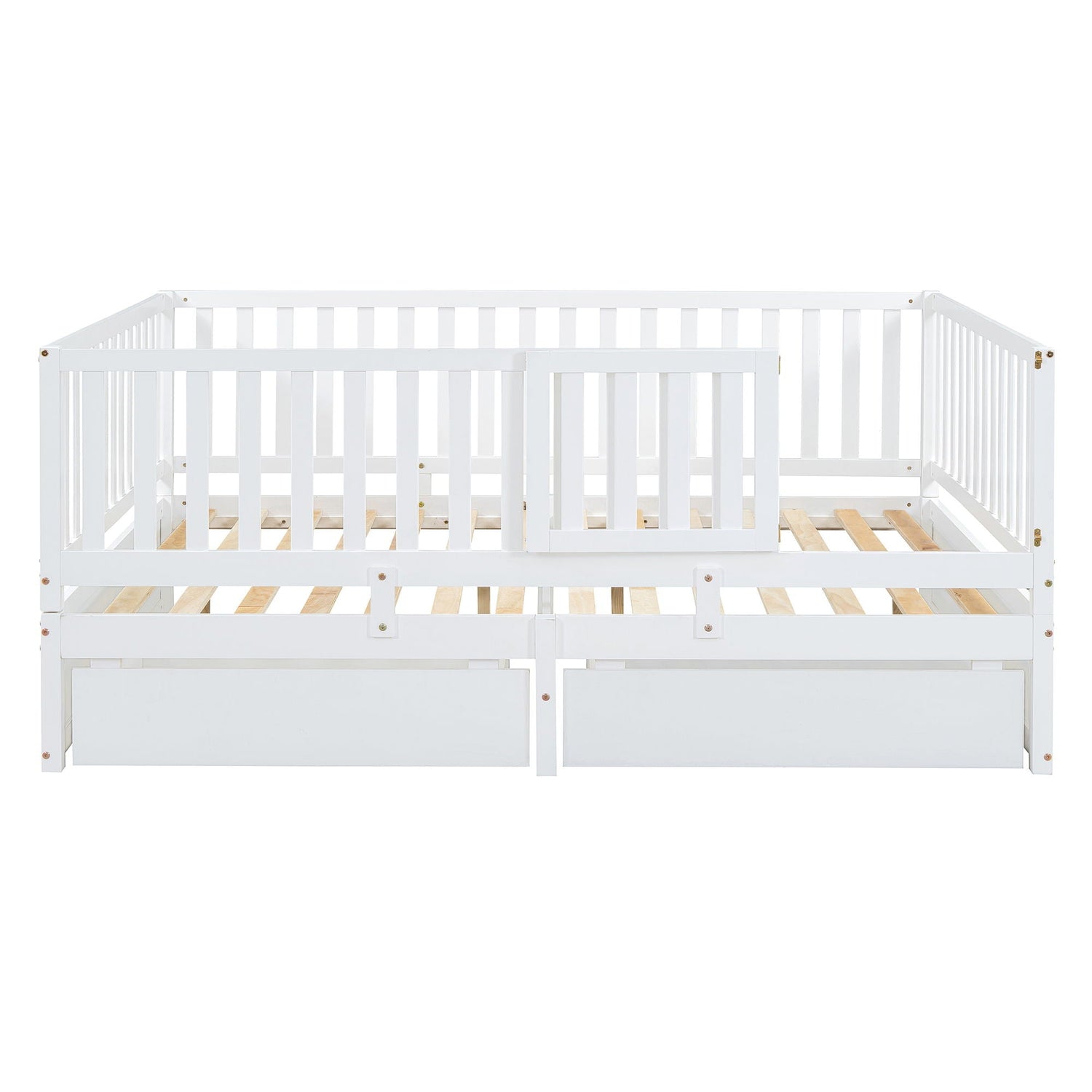 Full Size Daybed With Fence Guardrails And 2 Drawers, Convertible Floor Bed & Daybed - White