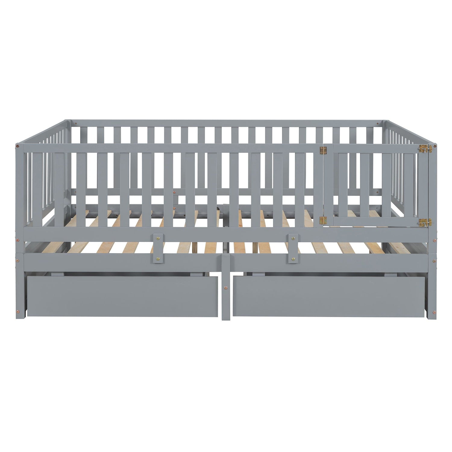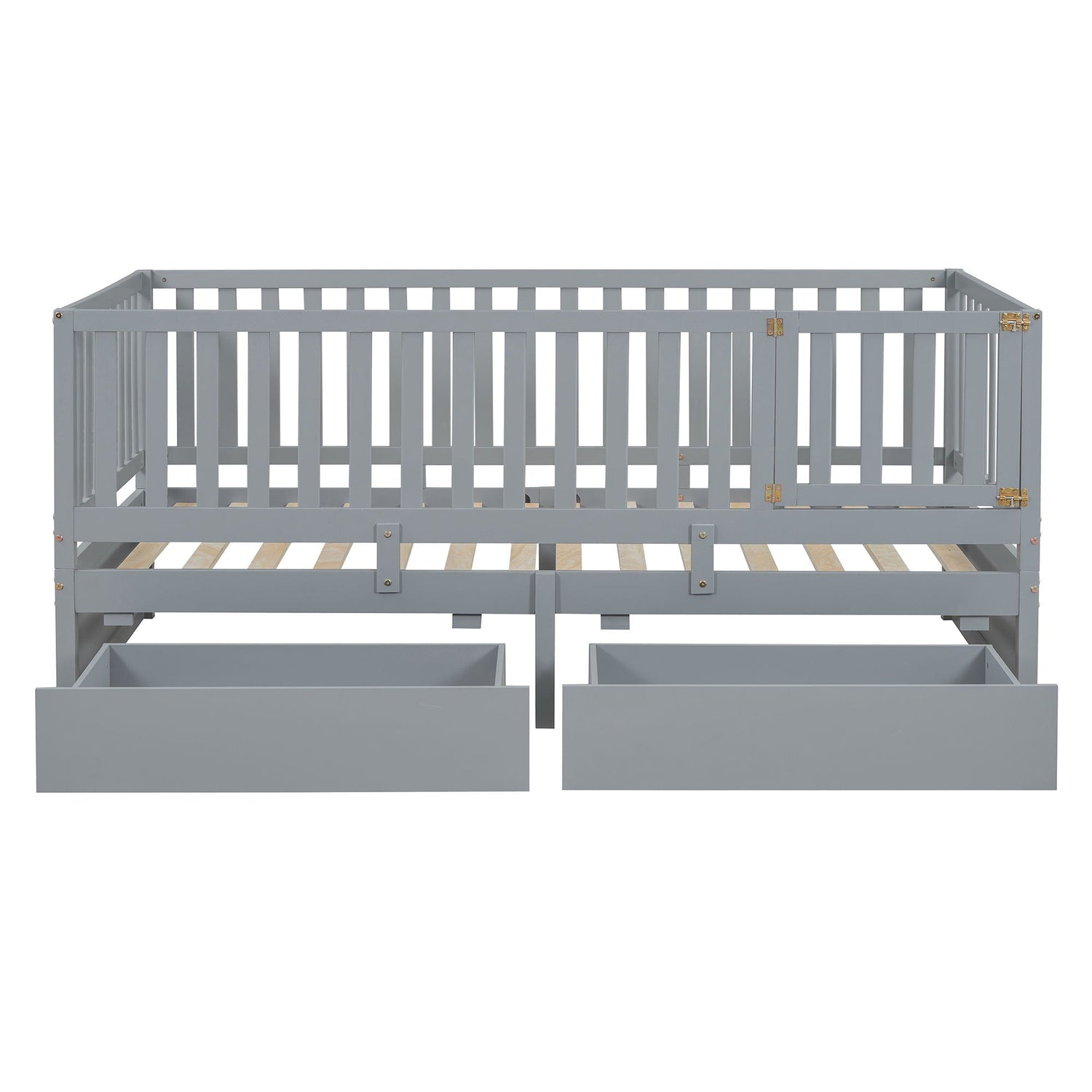 Twin Size Daybed With Fence Guardrails And 2 Drawers, Split Into Independent Floor Bed & Daybed - Gray