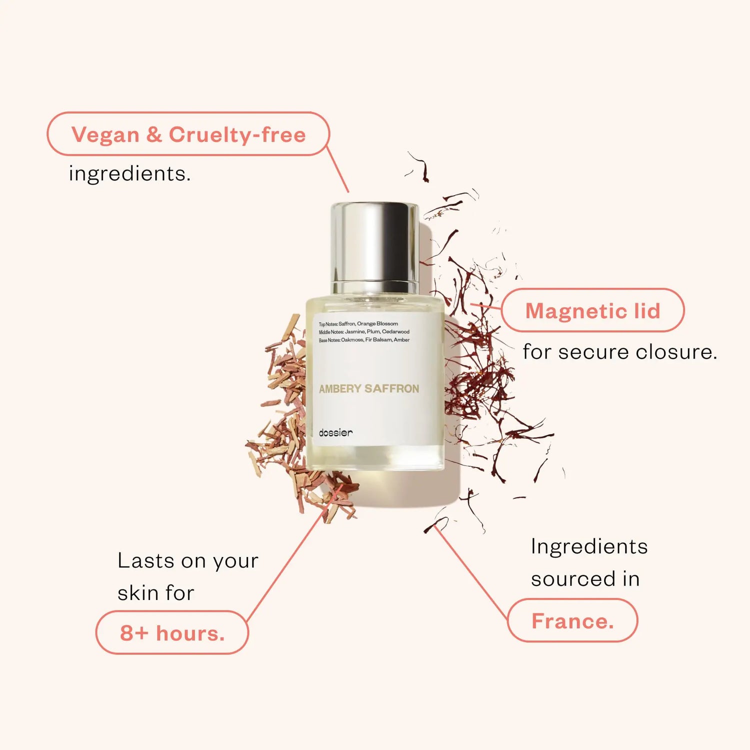 Introducing our captivating fragrance, Pure Fragrance Ambery Saffron. Immerse yourself in its enchanting opening as the captivating blend of Saffron and Orange Blossom greets your senses, creating a mesmerizing introduction to the scent. As you delve into the middle note, experience the perfume's depth and complexity with the interplay of Jasmine, Plum, and Cedarwood. These carefully chosen ingredients form a harmonious symphony that evokes elegance and sophistication, captivating those around you. In the base note, revel in the captivating embrace of Oakmoss, Fir Balsam, and Amber. These notes create a warm and lingering trail that leaves a lasting impression, enveloping you in their alluring and comforting essence. Inspired by MFK's B.accarat R.ouge 5.40, our perfume captures the essence of its enchanting and seductive allure. It goes beyond being a mere scent; it's an immersive experience that transports you to a world of luxury and indulgence. Crafted with the finest French ingredients sourced from Grasse, the perfume capital of the world, our eau de parfum reflects the highest standards and values. Our perfumers bring their expertise, using higher concentrations to ensure an exceptional olfactory experience. You can't have Dossier without that authentic French touch! At Dossier, we believe that high-quality fragrances should be accessible to everyone, not just a select few. Our goal is to promote equality by providing premium eau de toilette at affordable prices, allowing everyone to experience the luxury of exquisite scents. Our commitment to sustainability and ethical practices is reflected in our vegan and paraben-free formula. Following cosmetic safety recommendations, our perfumes are formulated with sustainable and highest quality ingredients, free from phthalates. Our fragrance is 100% non-toxic, cruelty-free, and eco-friendly, allowing you to indulge guilt-free.