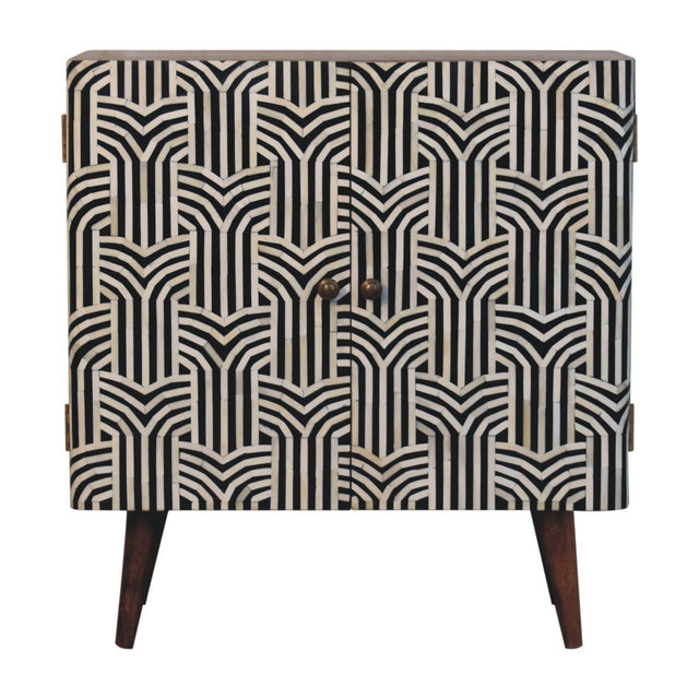 - Artisan Furniture Solid Wood Edessa Bone Inlay Cabinet - This beautiful boho inspired cabinet has been constructed from 100% solid mango wood and has a finish. Other features include bone inlay front doors, and Nordic style legs. The bone inlay is sourced responsibly from deceased animals such as camels, goats, and buffaloes.
