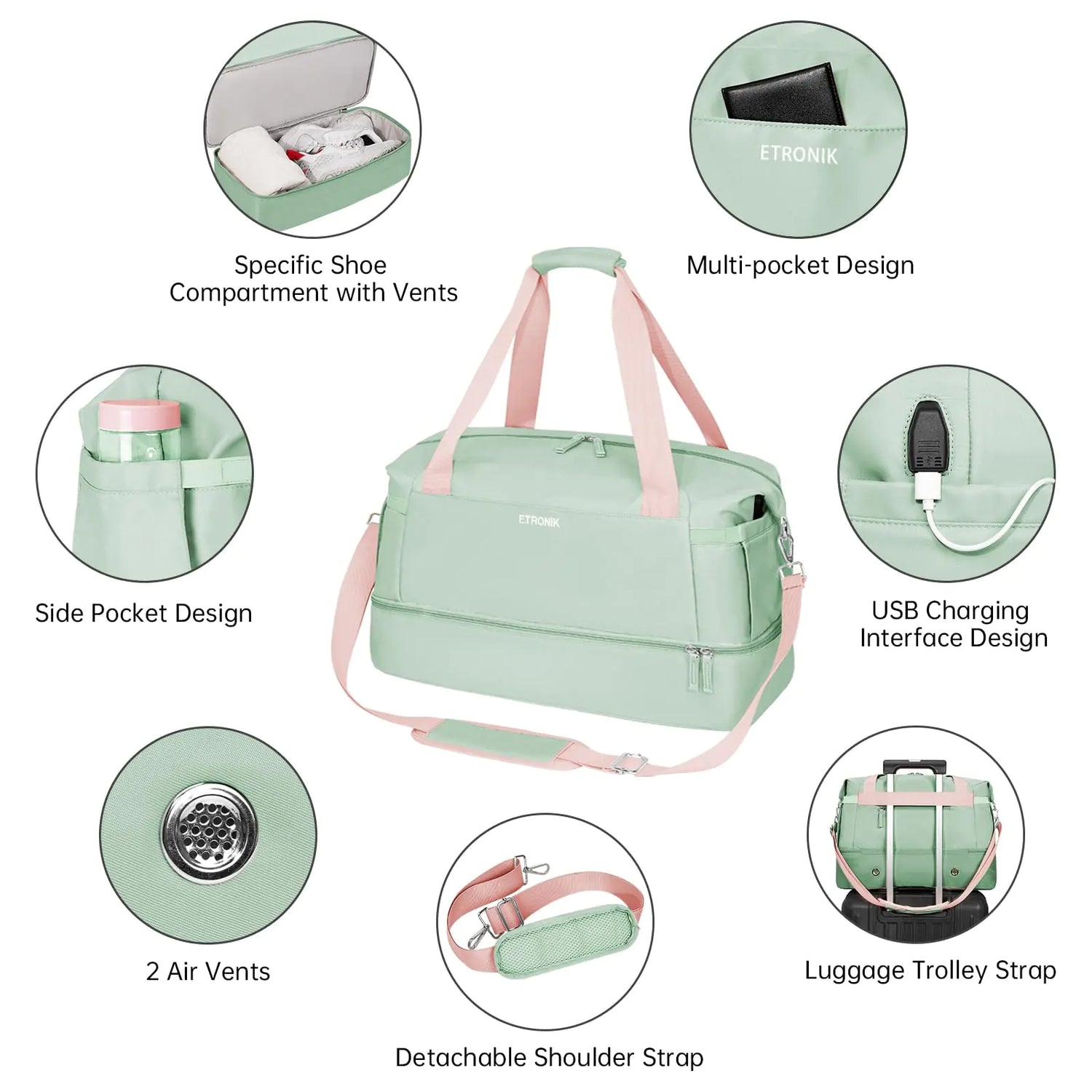 ETRONIK Gym Bag for Women, Travel Duffel Bag with USB Charging Port, Weekender Overnight Bag with Wet Pocket & Shoes Compartment for Women, Travel, Gym, Yoga (Green Pink)