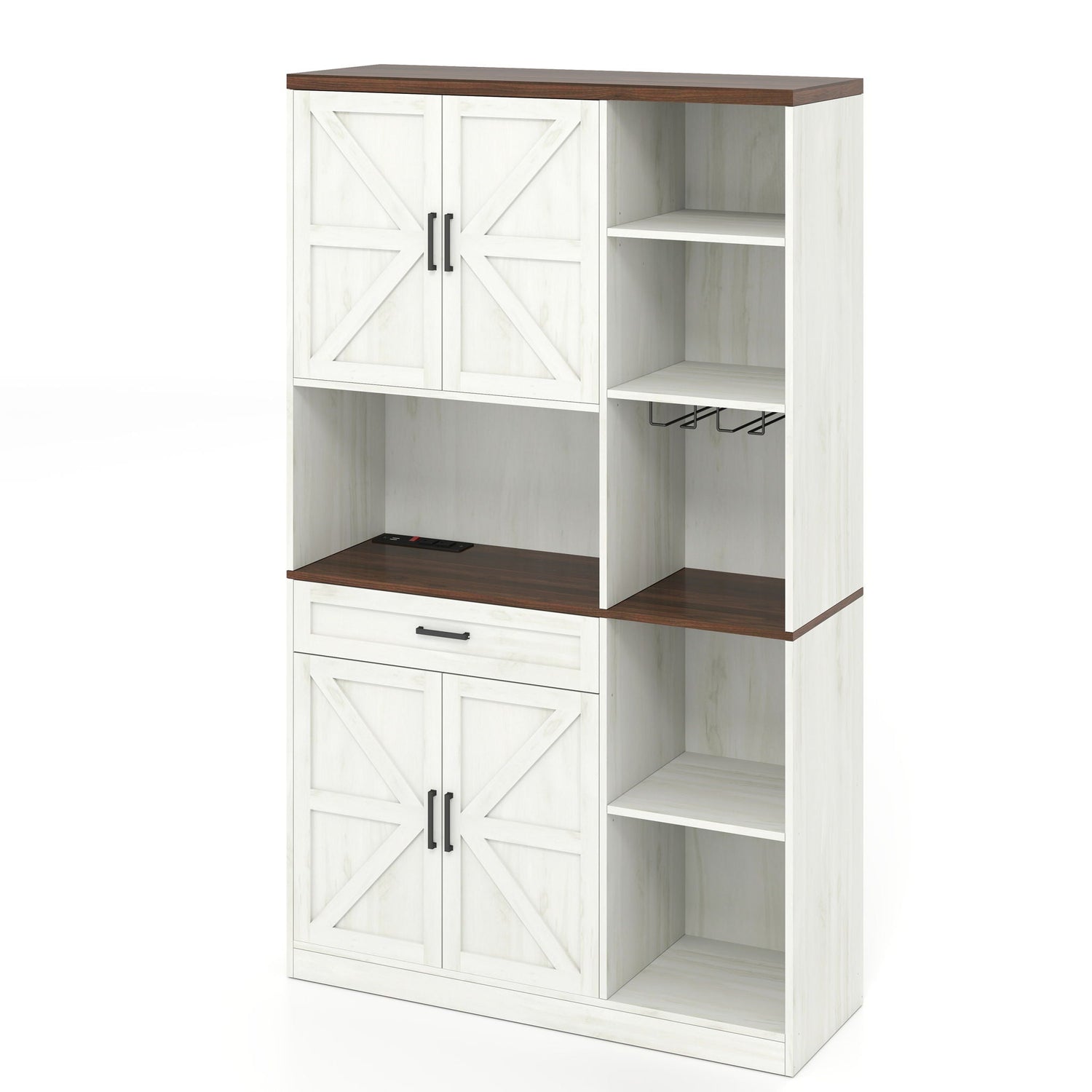 Farmhouse Kitchen Pantry Sideboard With Cabinet And Drawer, Multi Functional Kitchen Buffet With Hutch And Glass Holder, Microwave Stand With Charging Station - Brown / Antique White