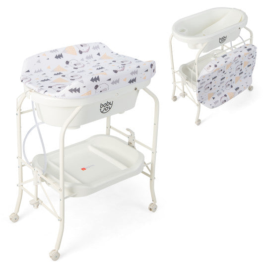 Folding Baby Changing Table with Bathtub and 4 Universal Wheels-White