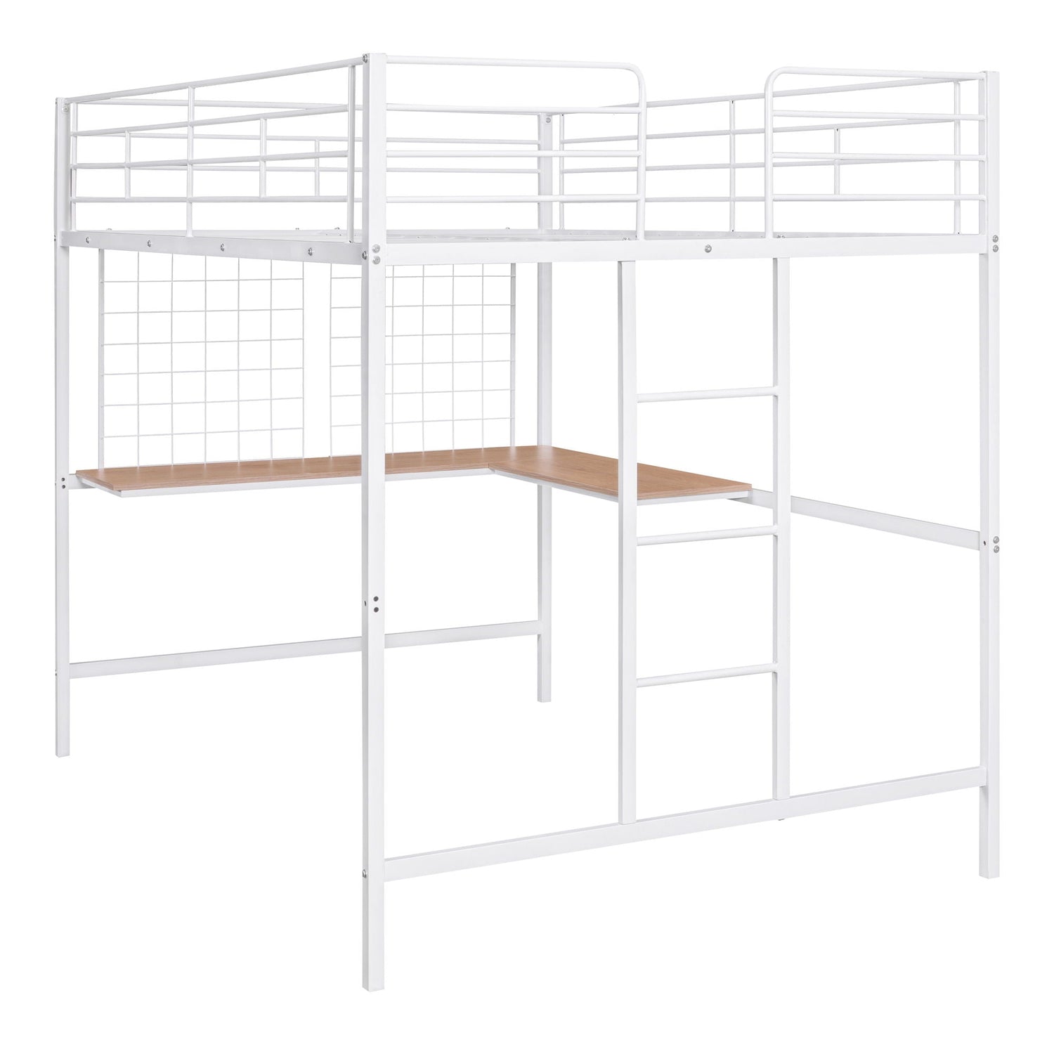 This full-size metal loft bed with a desk is made from sturdy metal and features a clean-cut silhouette that can be matched with any room decor. Designed with safety in mind, this loft bed includes a ladder integrated into the frame, making it easy to climb up and down. It also features full-length guardrails to ensure your child sleeps safely at night, as well as 20 secured heavy-duty metal slats and a support bar that provide ample support, stability, and air circulation for the mattress (no foundation or box spring needed). With this collection, you can transform any space into a workstation, a reading nook, or a craft area.