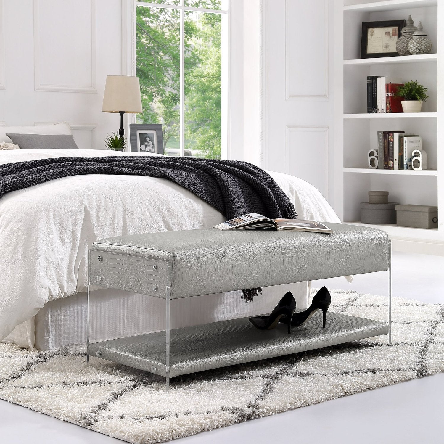 - MODERN DESIGN - Modern faux crocodile embossed two tier accent bench with shelf.