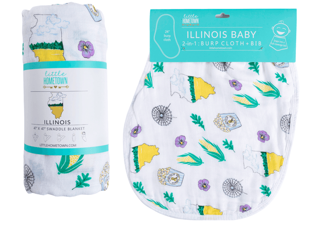 Gift Set: illinois Baby Muslin Swaddle Blanket and Burp Cloth/Bib Combo by Little Hometown