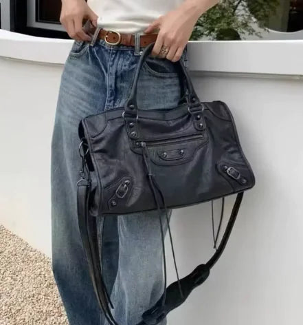 Gothic PU Leather Rivet Bag for Women – Large Capacity Black Biker Shoulder Bag, Retro Harajuku Crossbody, Y2K Style