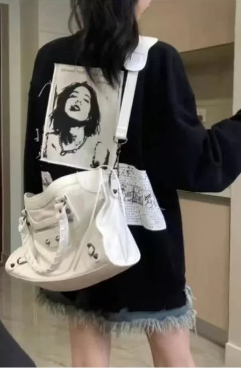 Featuring eye-catching rivet detailing, it adds an edgy flair to any outfit, making it perfect for those who love the retro Harajuku vibe. The spacious interior provides ample room for all your essentials, while the versatile crossbody design ensures comfort and ease of use.