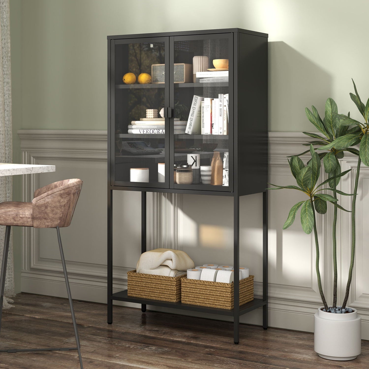 Heavy Duty Metal Storage Cabinet, Sideboards & Buffet, Display Storage Cabinet With Glass Doors And 2 Adjustable Shelves, Tall Bookcase Modern Bookshelf Cabinet For Home Office, Living Room - Black