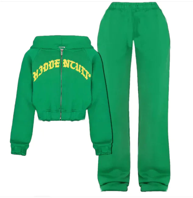 Ins Letter Sports Suit Zip-up Hooded Cropped Sweatshirt Top And Loose Drawstring Trousers Fashion Womens Clothing