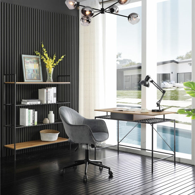 - STORAGE - This industrial-style writing desk has 1 drawer and 2 storage shelves. The two open compartments allow you to store office supplies off the top while still within reach. Its sole drawer equipped with glides for effortless motion.