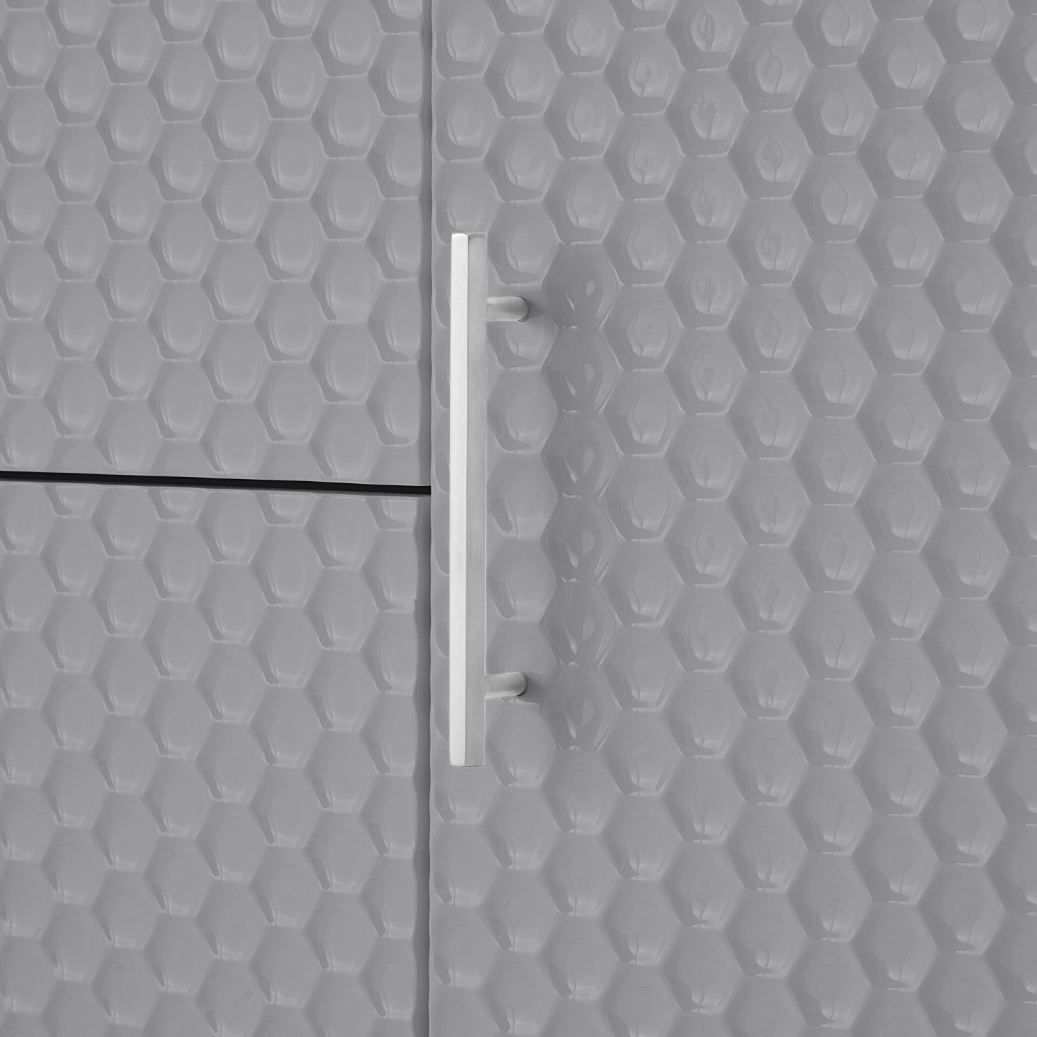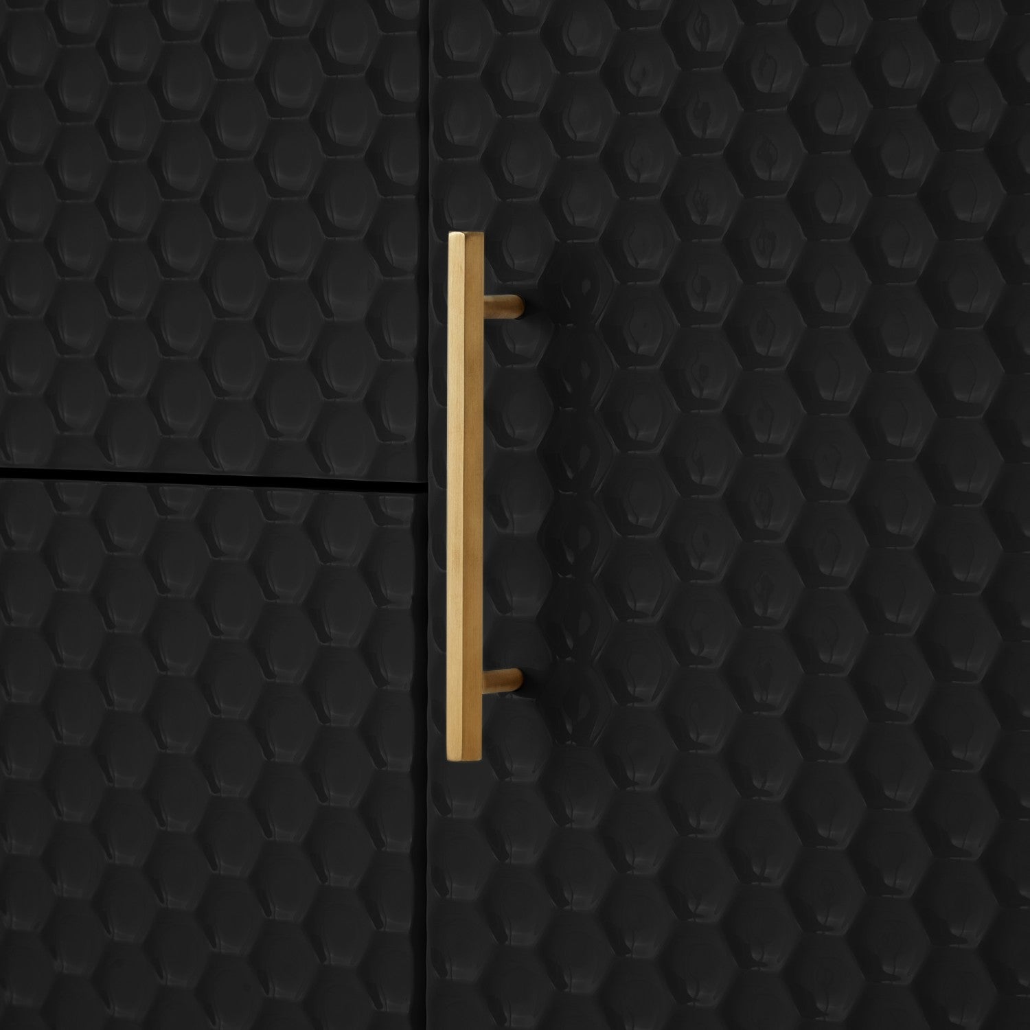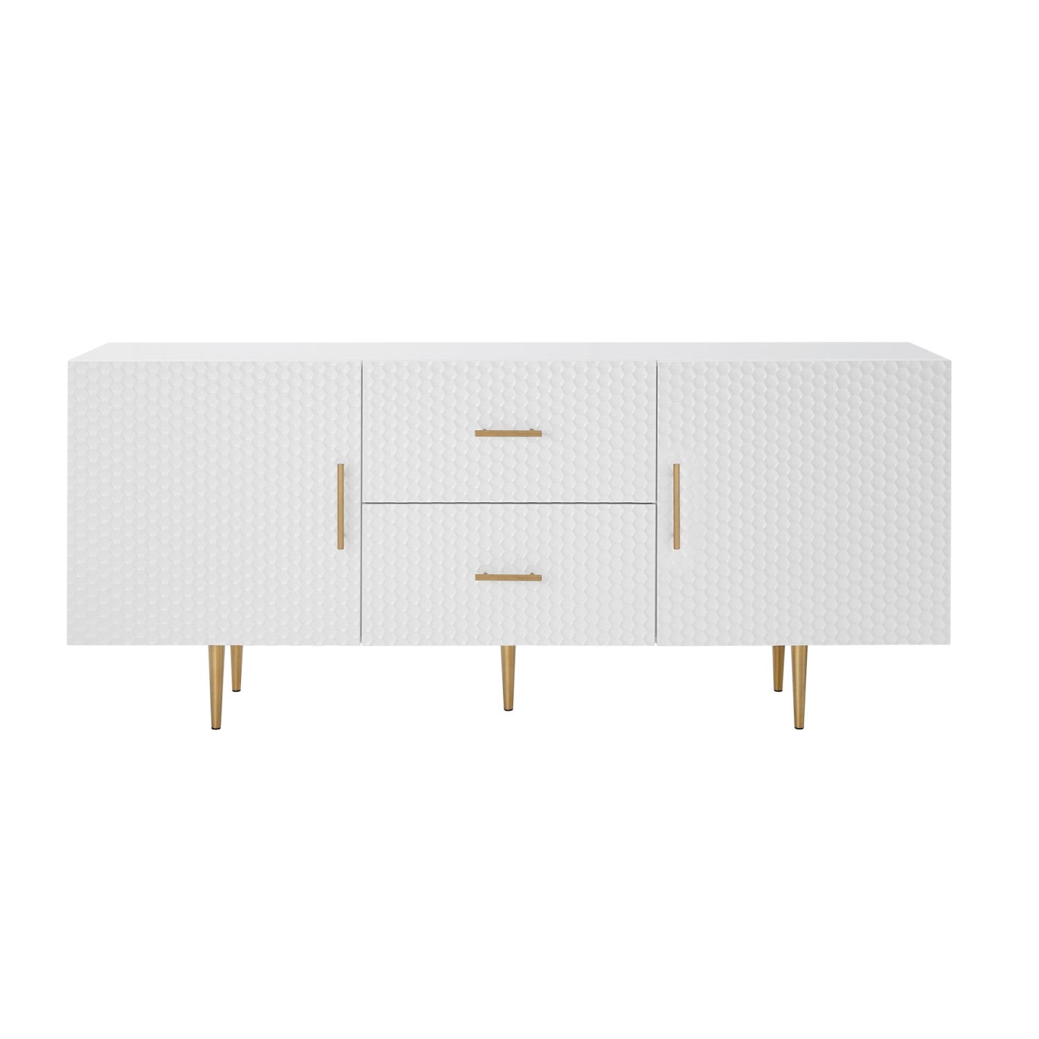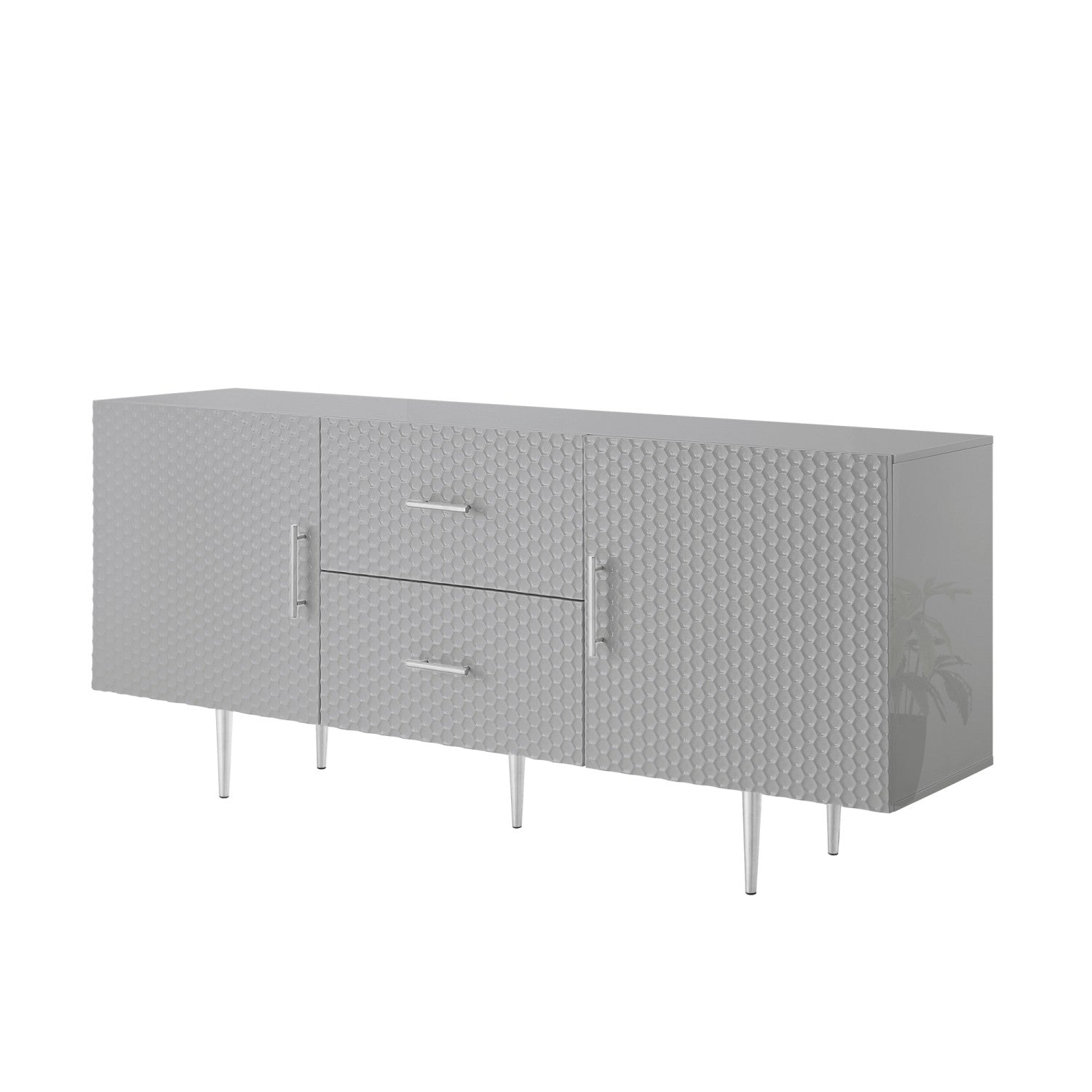 - ATTRIBUTES: 2 drawers, 2 doors, tapered legs, minimalist drawer pulls, sculptural raised wood pattern, geometric textured drawer face