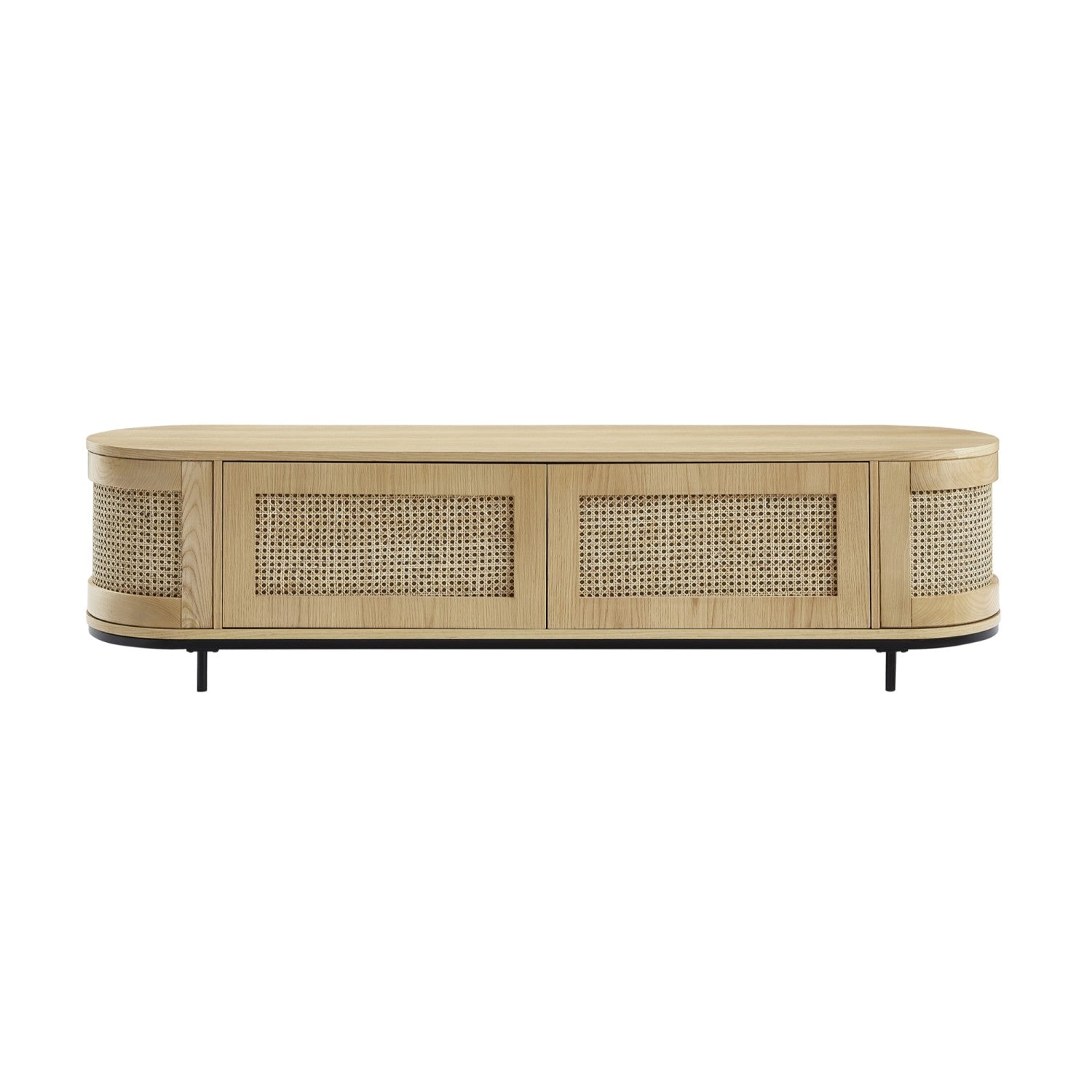 - RATTAN - Rattan Imitation TV stand with its detailed texture on the cabinet doors gives this entertainment console, made of manufactured wood, a sleek boho-chic design. The classic black legs with wood color cabinet combine retro and modern feel.