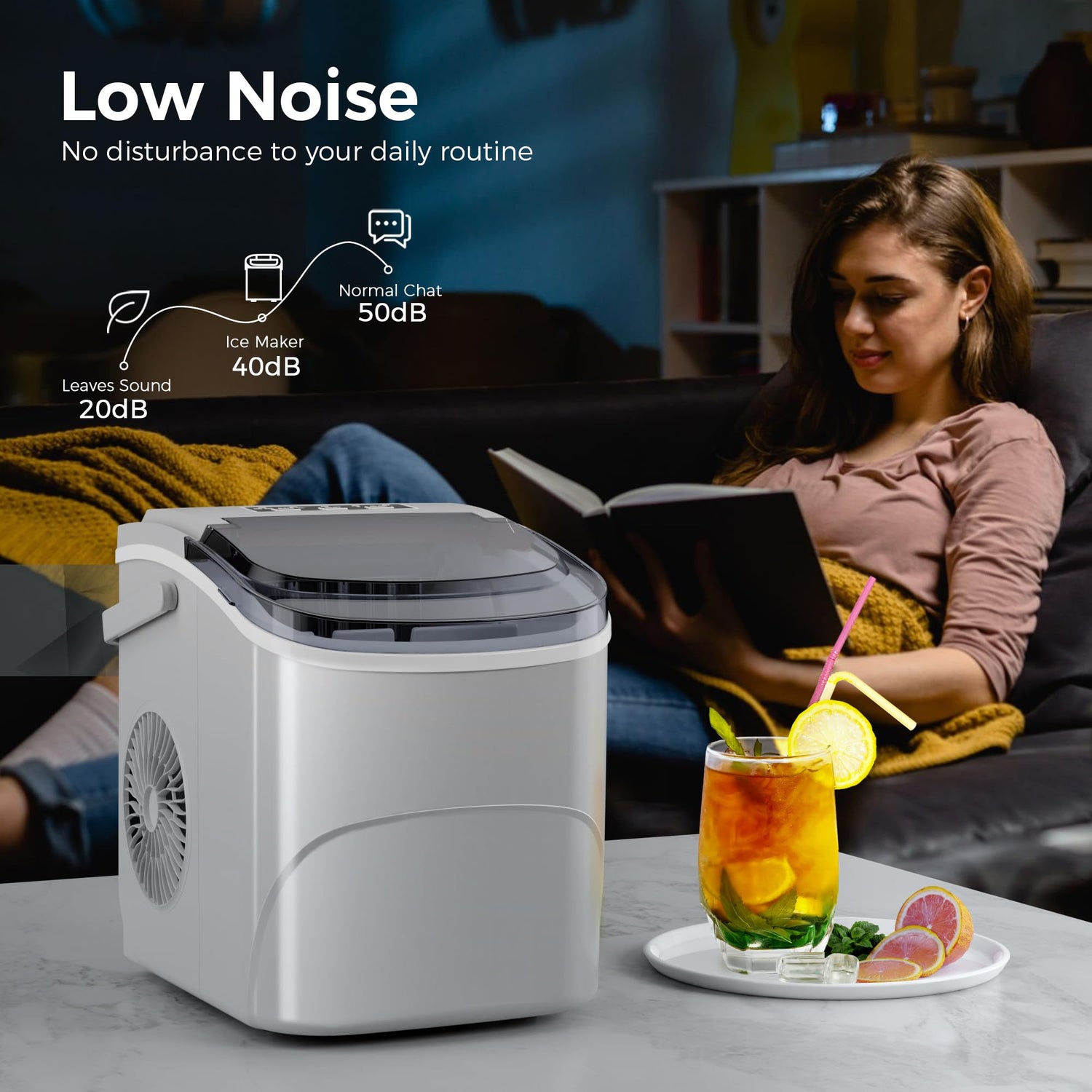 【Portable and Friendly Design】Designed for on-the-go lifestyles, small ice maker has been upgraded and improved with a sturdy handle and compact dimensions of 11.42*8.74*11.57 inches, weighing 14.25 pounds, it is extremely convenient both on the go and in storage. The large viewing window adds a user-friendly experience to observe the ice-making process in real-time.