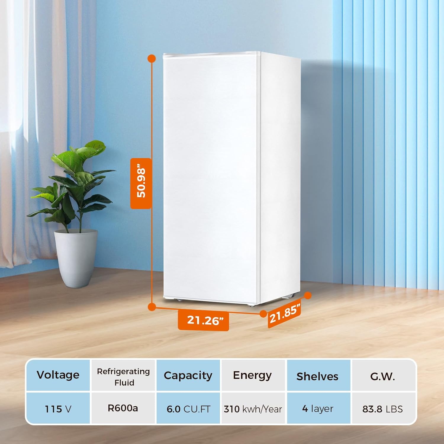 - Large Capacity for Protection:Compact design, 6.0Cu.ft large internal capacity, including two removable shelves, flexible storage space can reasonably include a variety of food. Suitable for meat, seafood, ice cream, breast milk, and other quick-frozen products. Just this small freezer can satisfy the whole family's freshness needs! Measures: 21.26’’*21.85’’*50.98’’
