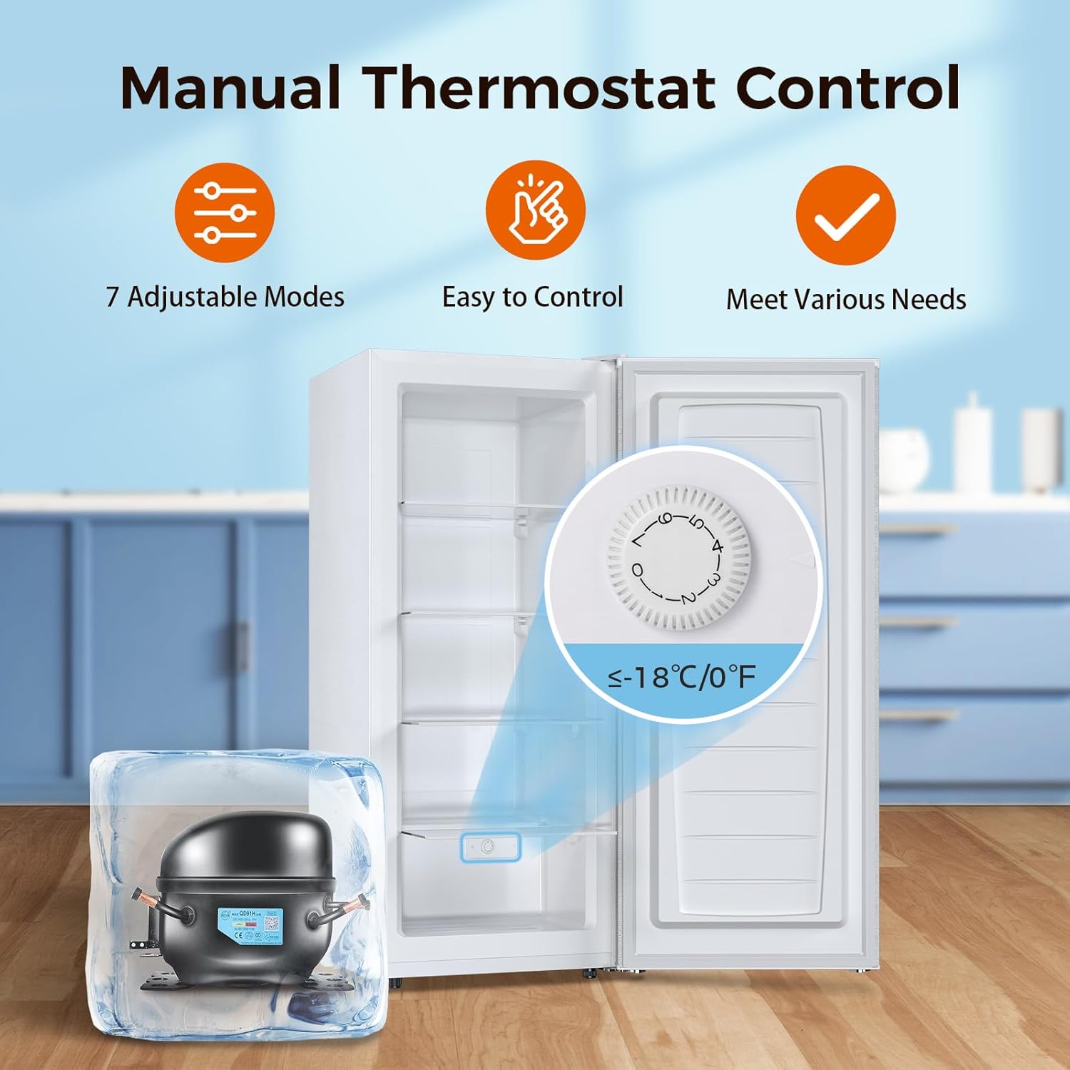 - Suitable for Any Place: The Compact Upright Freezer combines contemporary style with cutting-edge refrigeration technology, suitable size suitable for university dormitory, RV, apartment, or office. Allowing flexible storage solutions for apartments, RVs, mobile homes, or as supplementary units in larger households