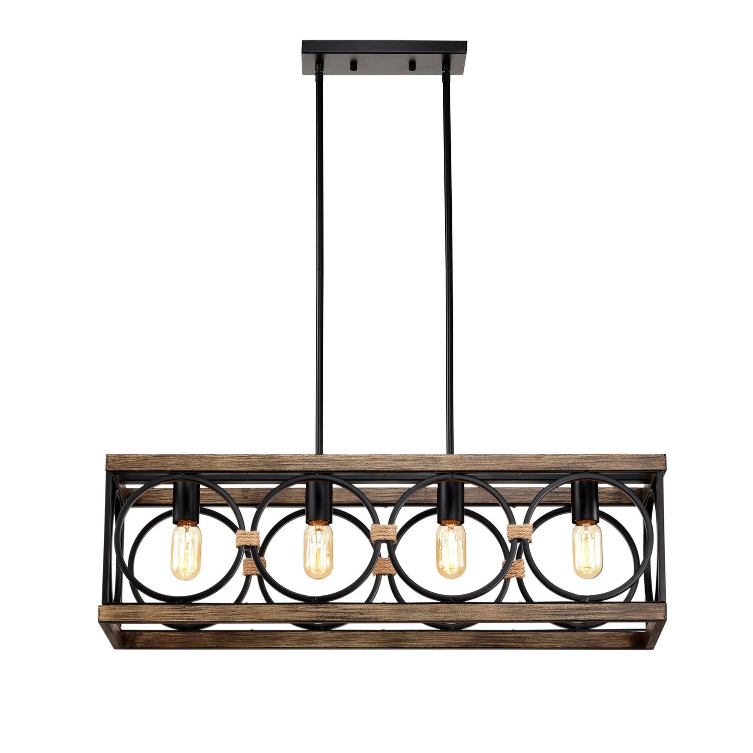4 Light (Bulb No Included) Farmhouse Rectangle Pendant Light, Wood Texture Vintage Rustic Chandeliers Metal Industrial Hanging Light Fixtures For Kitchen, Entryway, Dining Room - Black / Natural