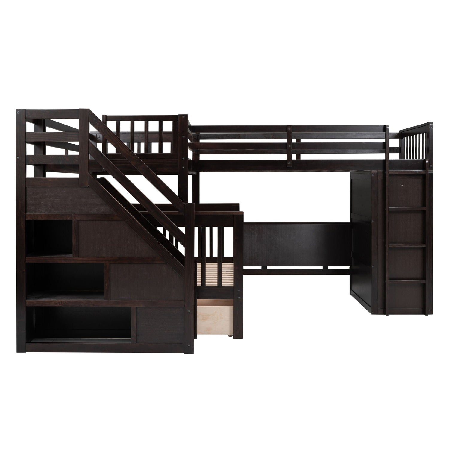 Couch.com Twin Twin Over Full L Shaped Bunk Bed With 3 Drawers, Portable Desk And Wardrobe Espresso, Wood Construction, Dark Brown Finish, Twin over Full Size