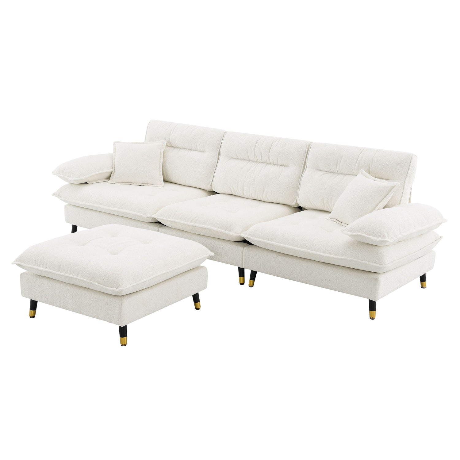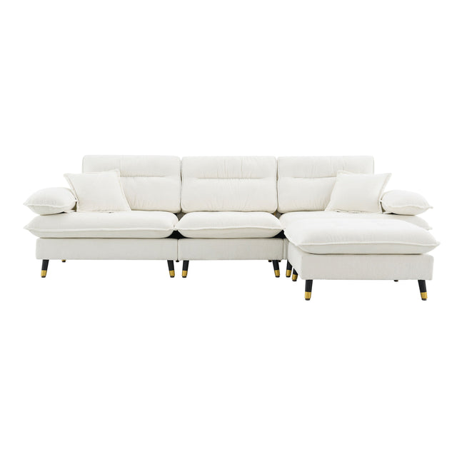 L Shaped Convertible Sectional Sofa 4 Seat Tufted Couch Set With Two Tone Adjust Legs Cloud Movable Ottoman - White